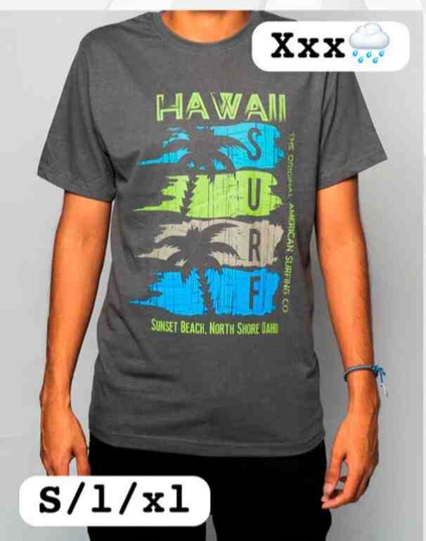 Camiseta de manga corta con diseño de surf inspirado en Hawaii. Ideal para un look casual y relajado, perfecta para los amantes del surf y la playa. Disponible en tallas S, L y XL, esta camiseta ofrece comodidad y estilo en un solo paquete.