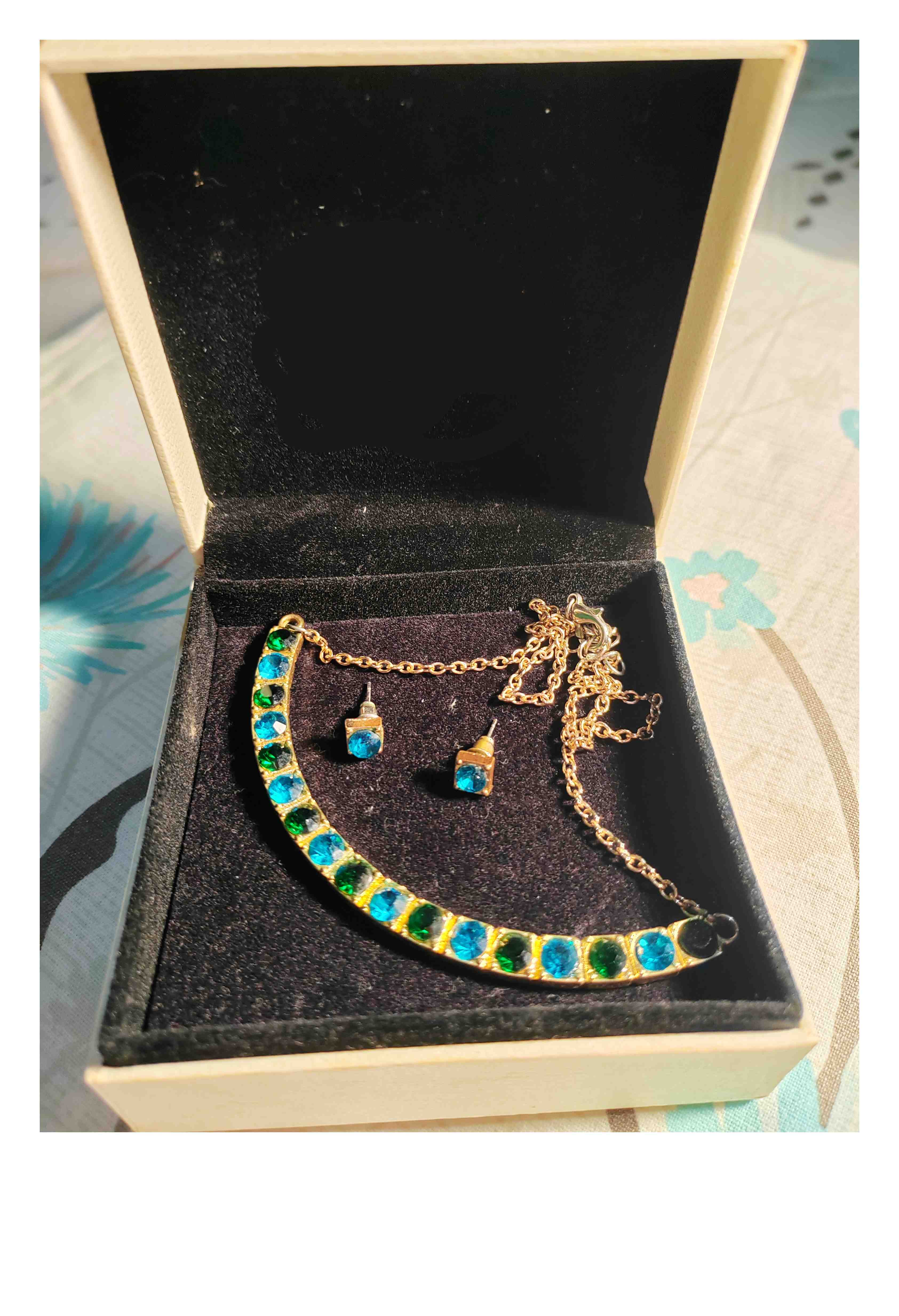 Este hermoso conjunto incluye un collar y aretes con brillantes piedras azules y verdes, perfectos para cualquier ocasión especial. El diseño elegante y sofisticado resalta con su cadena dorada, ofreciendo un toque de lujo. Ideal para complementar cualquier atuendo, este set es un regalo perfecto para alguien especial.