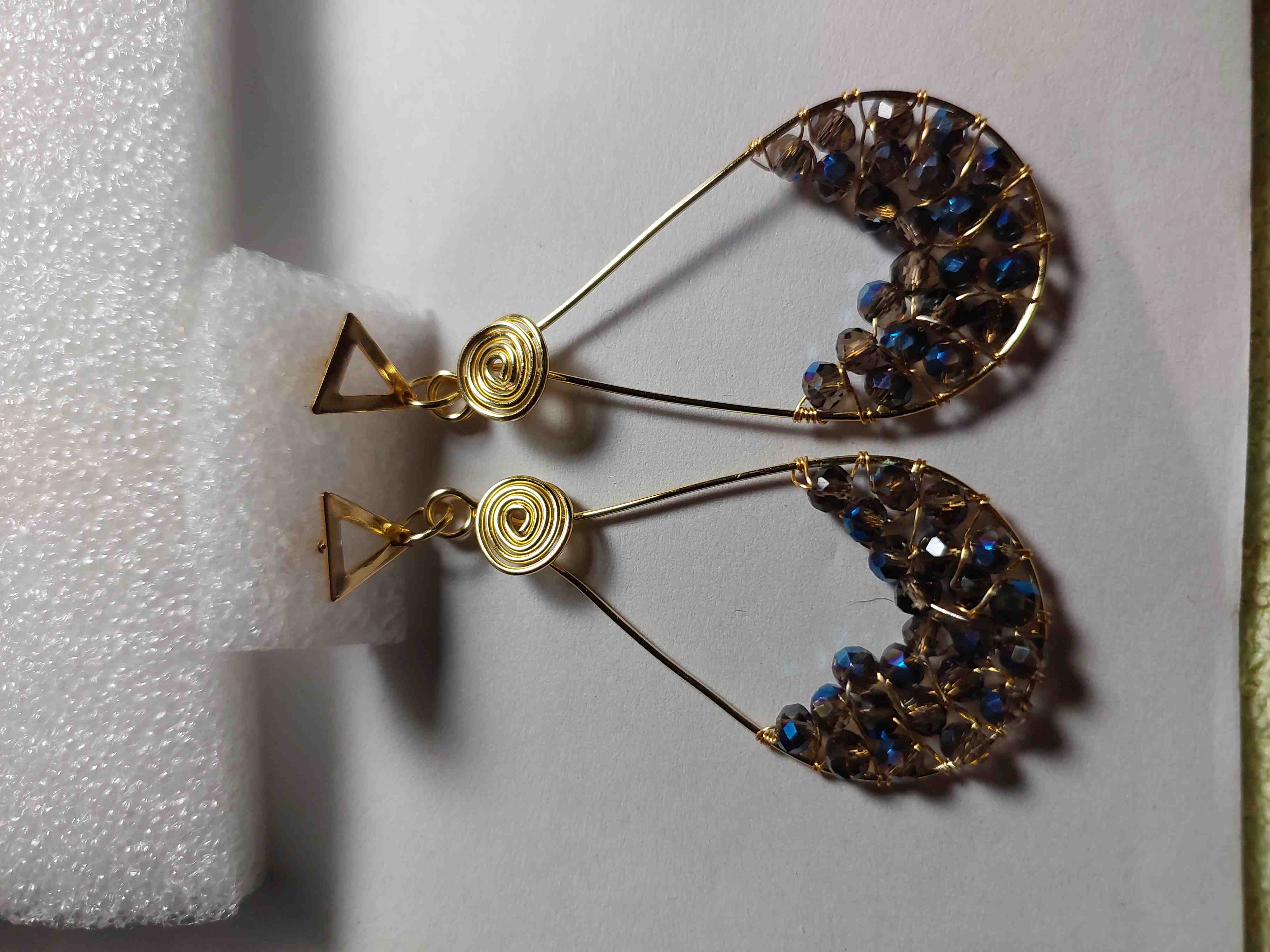 Estos aretes presentan un diseño único con alambre dorado en forma de espiral y cuentas brillantes en tonos azules y marrones. Son ligeros y cómodos de llevar, perfectos para complementar cualquier atuendo elegante. Su diseño artesanal los hace ideales para ocasiones especiales o para añadir un toque de sofisticación a tu día a día.