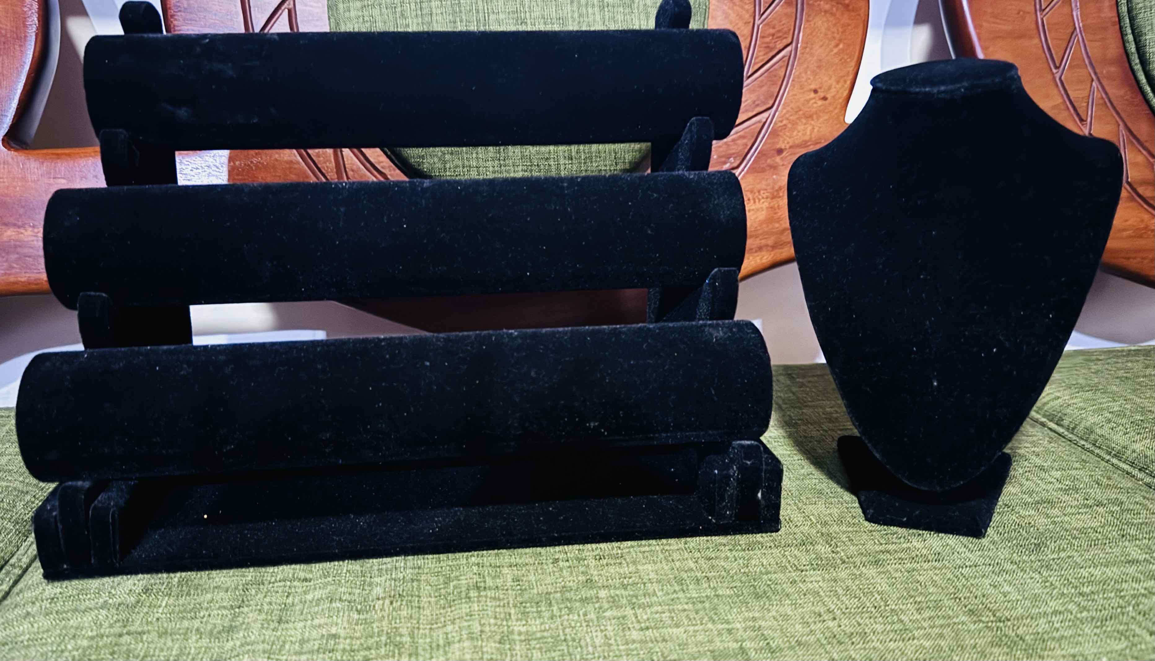Elegante exhibidor de joyas con acabado en terciopelo negro, ideal para mostrar collares, pulseras y otros accesorios. Incluye un soporte vertical para collares y un soporte horizontal de tres niveles para pulseras. Perfecto para tiendas o uso personal, ofreciendo un toque sofisticado a cualquier colección de joyas.
