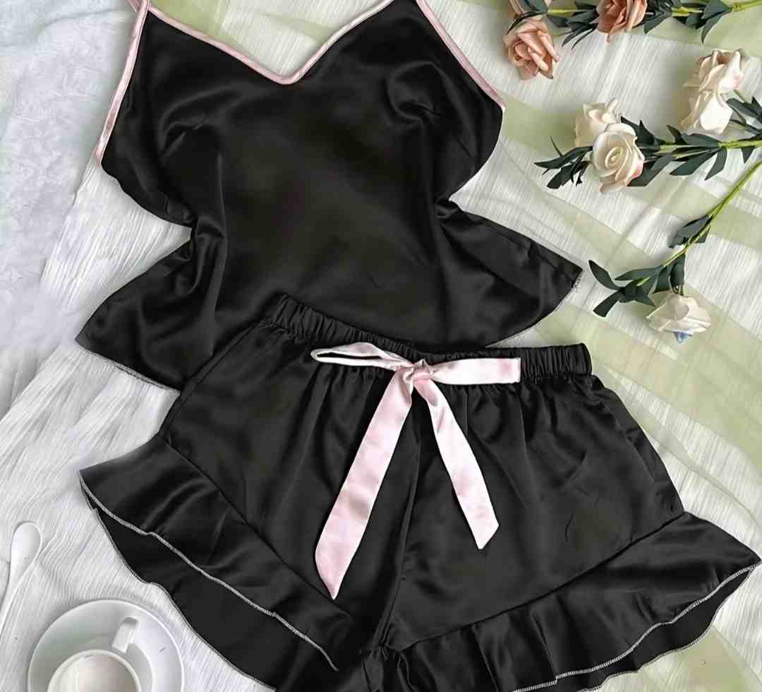 ribetes en contraste, mientras que los shorts tienen un lazo decorativo que añade un toque femenino. Ideal para quienes buscan comodidad y sofisticación en su ropa de