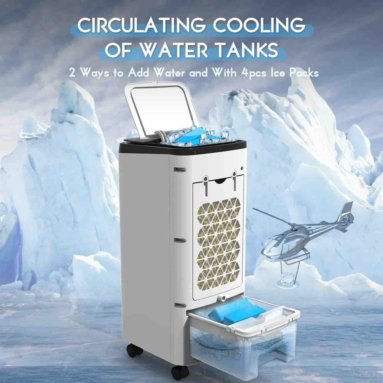 Este innovador enfriador de agua ofrece un sistema de enfriamiento circulante que mantiene tus espacios frescos y confortables. Con dos maneras de añadir agua y cuatro paquetes de hielo incluidos, es ideal para cualquier ambiente. Su diseño moderno y funcional se adapta a cualquier espacio, mientras que sus ruedas facilitan el traslado. Perfecto para mantener la temperatura ideal en días calurosos.