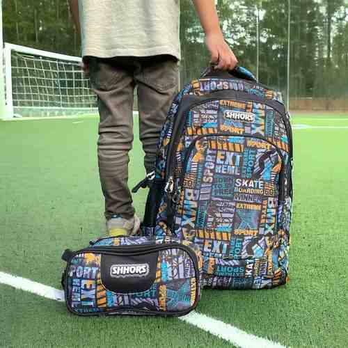 Este conjunto de mochila y estuche SHHORS es perfecto para los amantes del estilo urbano. Con un diseño vibrante lleno de palabras relacionadas con el skate y el deporte, es ideal para llevar a la escuela o para actividades al aire libre. La mochila ofrece amplio espacio de almacenamiento y comodidad gracias a sus correas ajustables. El estuche complementa el conjunto, proporcionando un lugar seguro para guardar útiles escolares o accesorios personales.