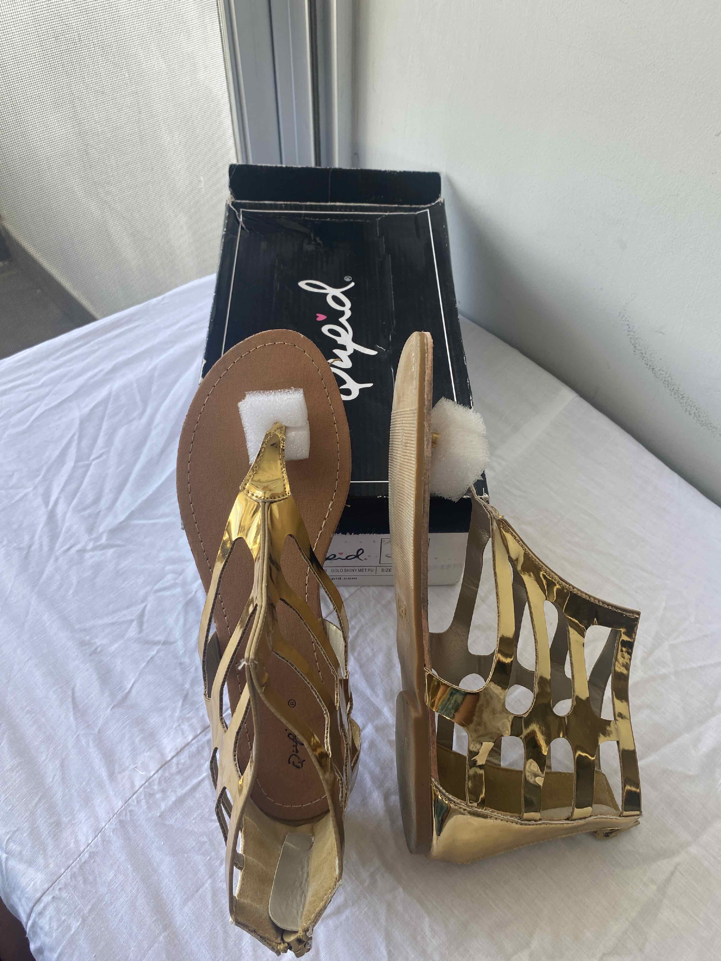 Estas elegantes sandalias doradas de la marca Cupid son perfectas para cualquier ocasión especial. Con un diseño de tiras entrelazadas, ofrecen un ajuste cómodo y seguro. El acabado metálico brillante añade un toque de glamour a tu atuendo. Ideales para combinar con vestidos de verano o atuendos de noche.
