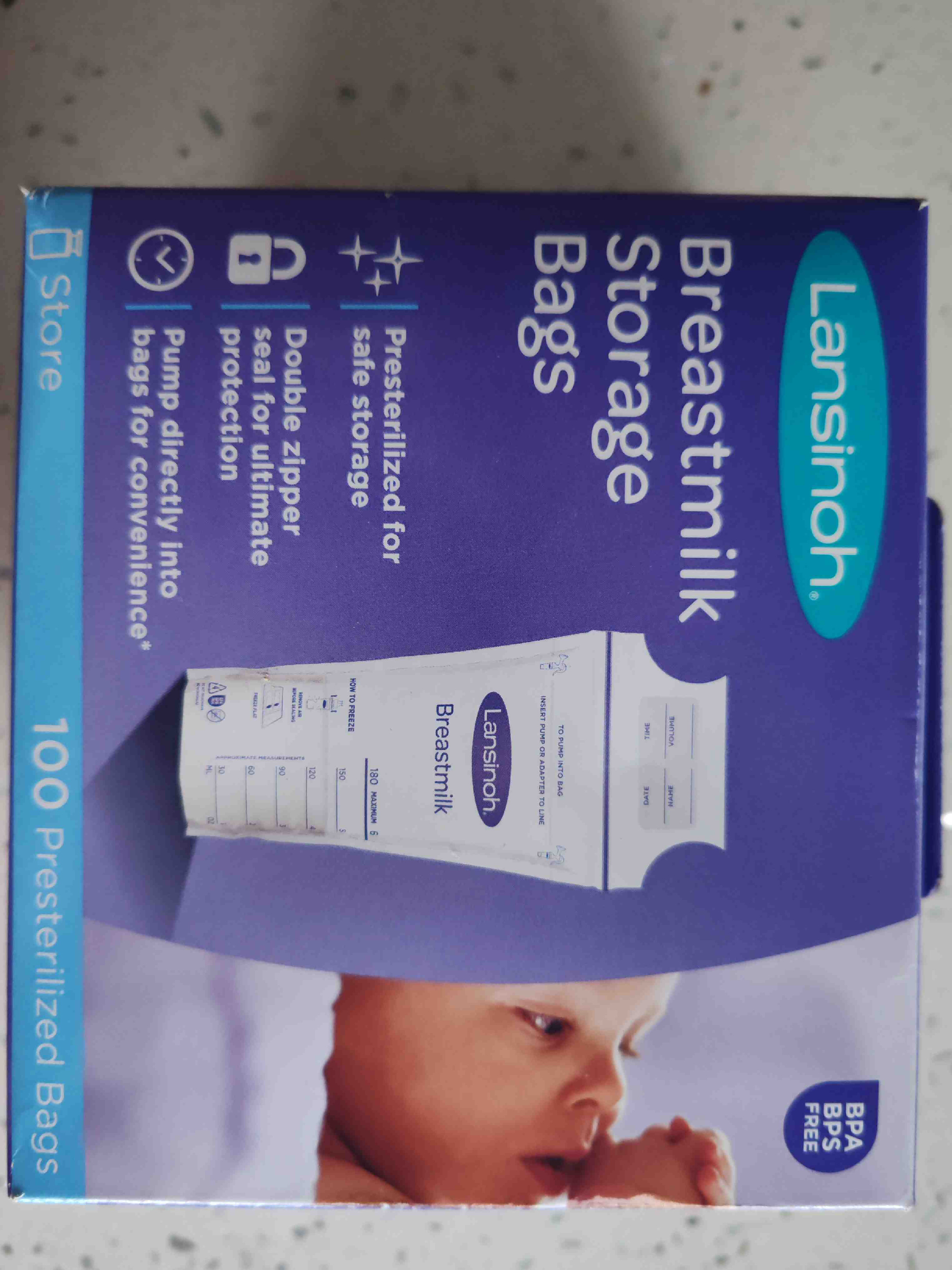 Bolsas de almacenamiento de leche materna marca Lansinoh, caja de 100 bolsas.
