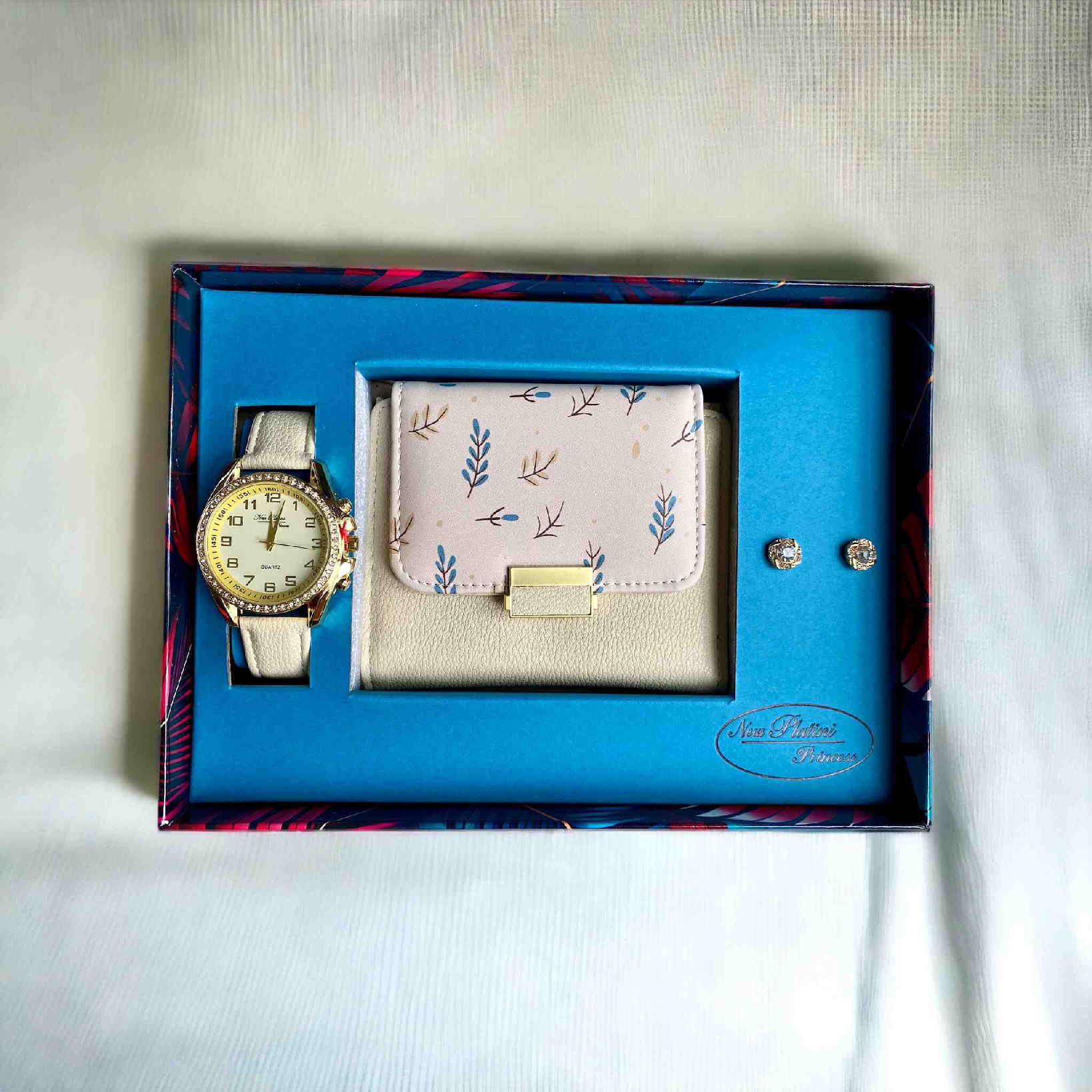 Este set incluye un elegante reloj con correa de cuero sintético y esfera dorada, perfecto para cualquier ocasión. La cartera presenta un diseño floral delicado, ideal para llevar tus esenciales con estilo. Completa el conjunto con unos aretes brillantes que añaden un toque de sofisticación a tu look. Este set es un regalo perfecto para alguien especial o para consentirte a ti misma.