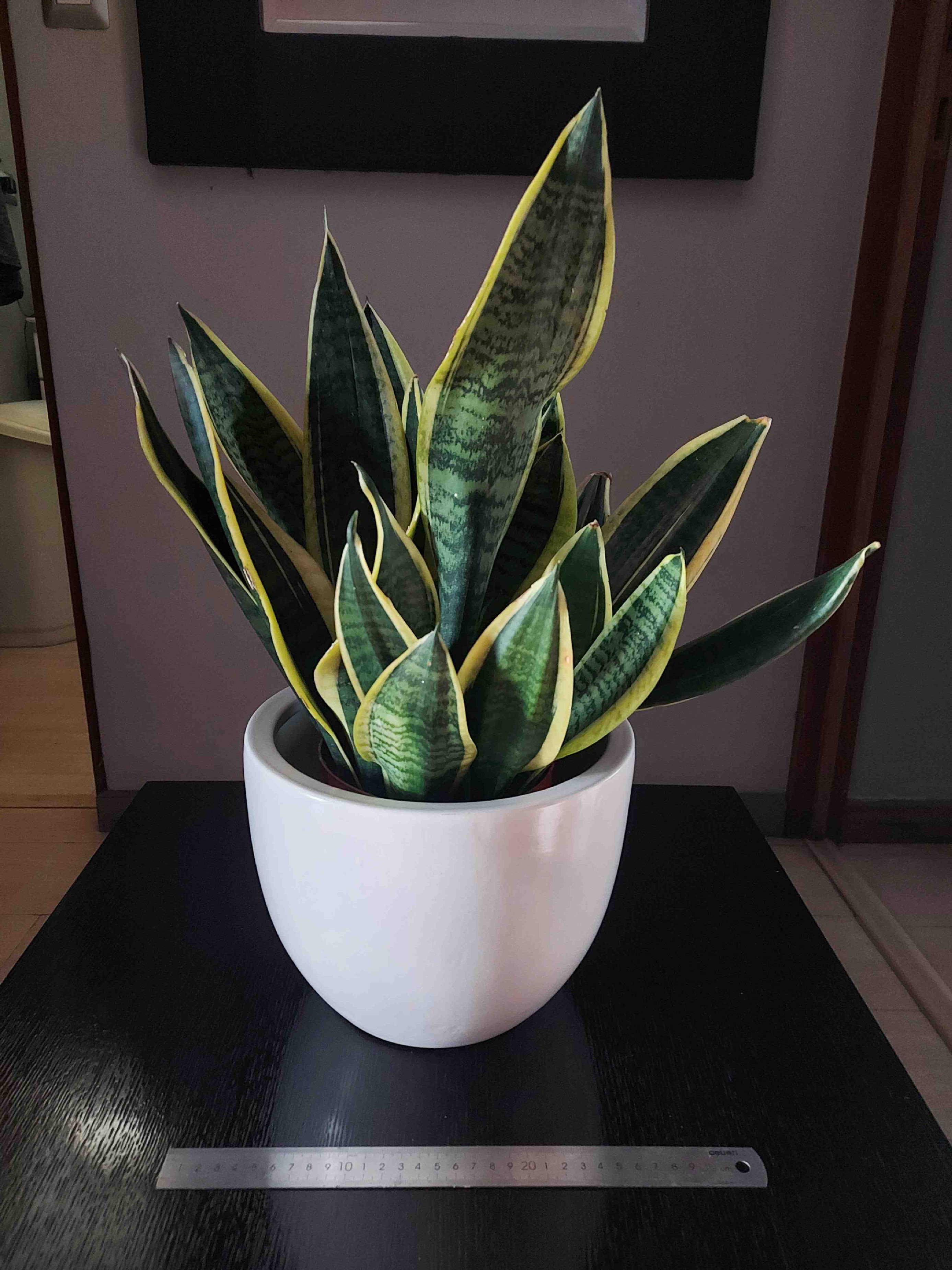 Esta elegante planta Sansevieria, también conocida como lengua de suegra, es perfecta para decorar cualquier espacio interior. Sus hojas verdes con bordes amarillos aportan un toque de frescura y modernidad. Es una planta de bajo mantenimiento, ideal para quienes buscan belleza sin complicaciones. La maceta blanca es de tienda Altea, esmaltada lisa, resalta su atractivo natural, convirtiéndola en un elemento decorativo versátil.