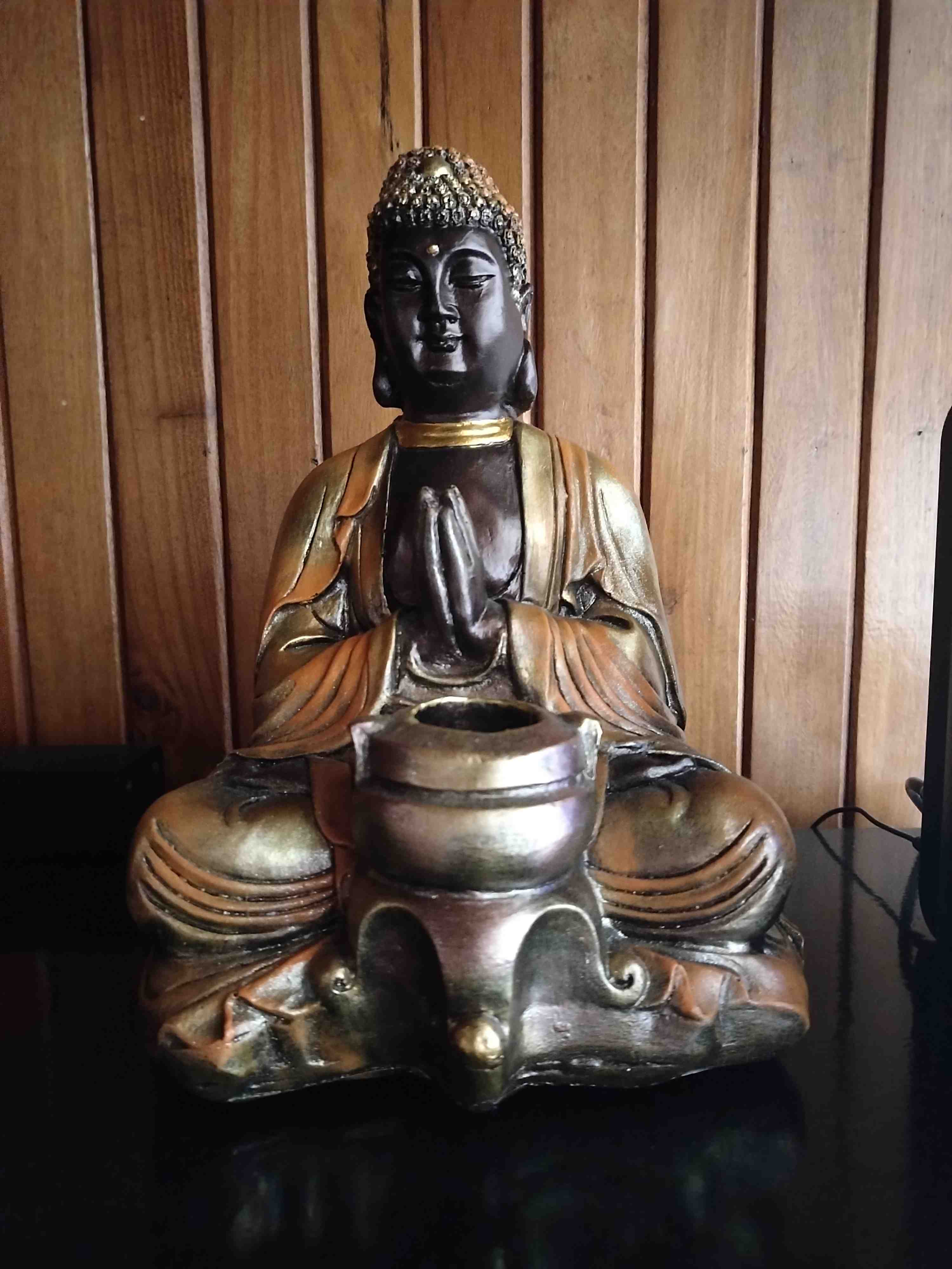 Esta estatua de Buda es una pieza decorativa ideal para cualquier espacio que busque transmitir paz y serenidad. Con un acabado en tonos dorados y marrones, esta figura representa a Buda en una postura de meditación, sosteniendo un cuenco. Perfecta para el hogar, oficina o espacio de meditación, esta estatua es un símbolo de tranquilidad y sabiduría. Su diseño detallado y su tamaño la convierten en un elemento central en cualquier decoración.