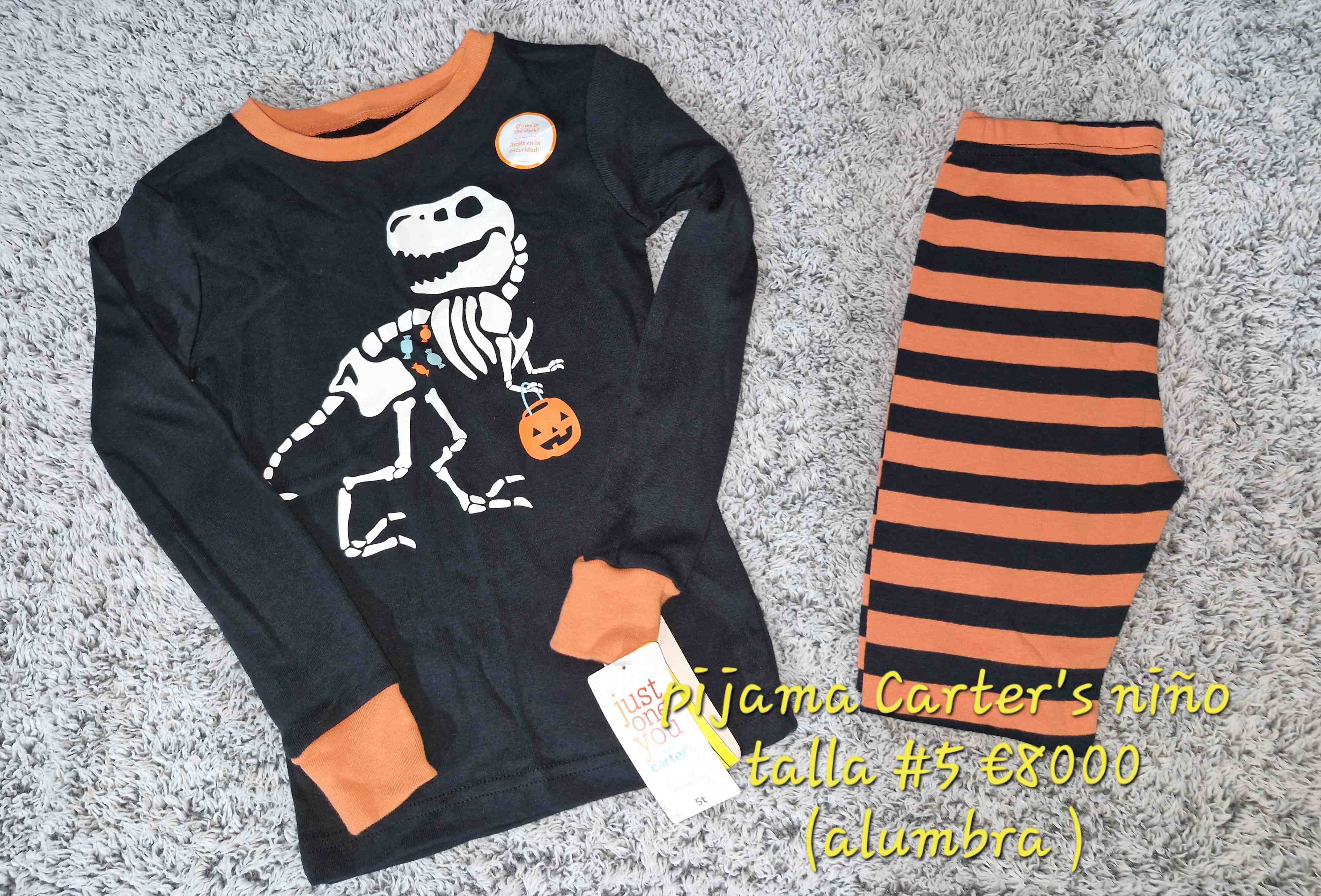 Este encantador pijama de Carter's para niño es perfecto para la temporada de Halloween. Con un diseño de esqueleto de dinosaurio que brilla en la oscuridad, es ideal para hacer las noches más divertidas. La camiseta de manga larga y los pantalones a rayas naranjas y negras ofrecen comodidad y estilo. Fabricado con materiales suaves y de alta calidad, garantiza un descanso placentero.