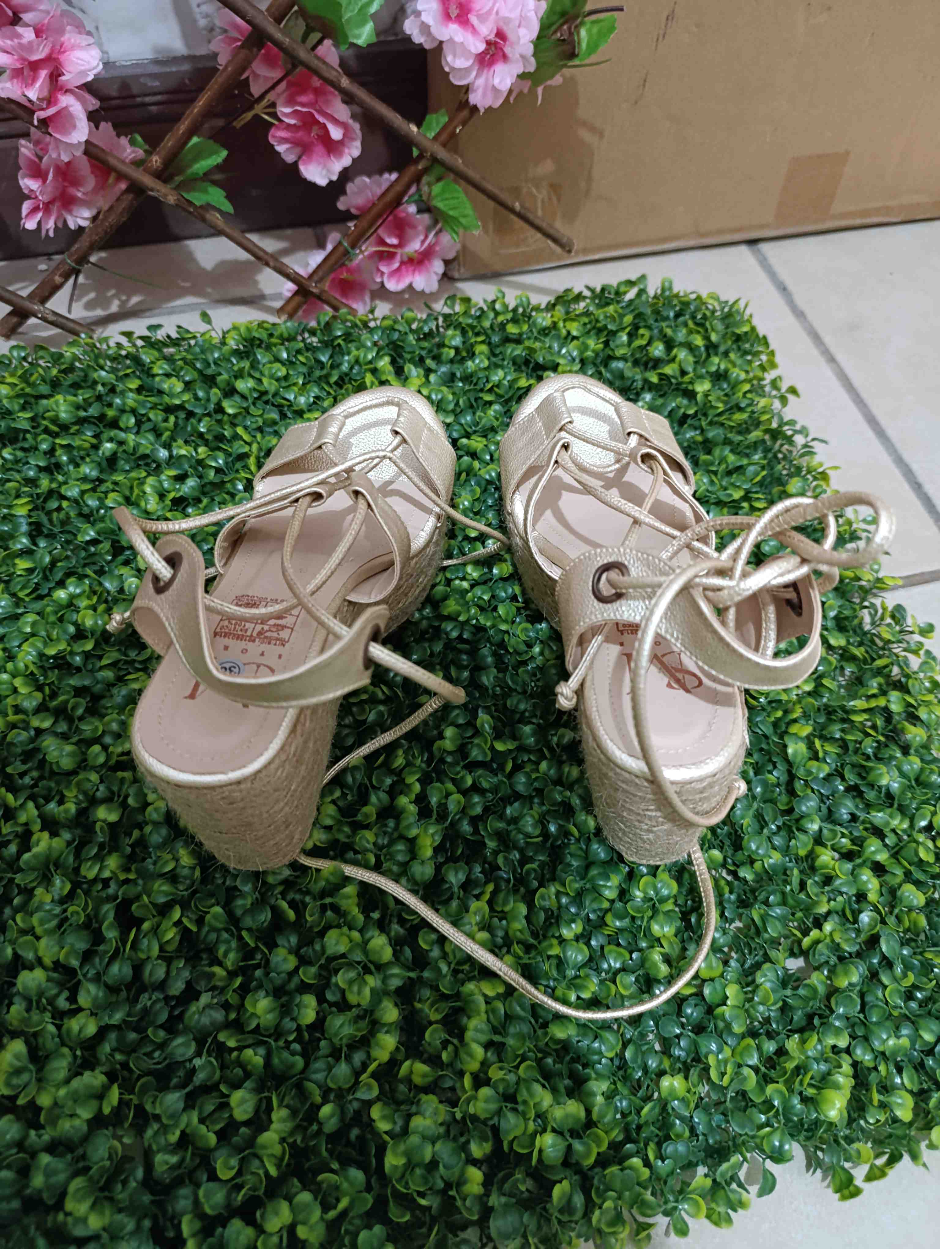 Estas sandalias doradas son perfectas para cualquier ocasión especial. Con un diseño elegante y moderno, forradas en yute que proporciona altura y comodidad. Los cordones ajustables aseguran un ajuste perfecto, mientras que el acabado brillante añade un toque de glamour. Ideales para combinar con vestidos o conjuntos de verano.