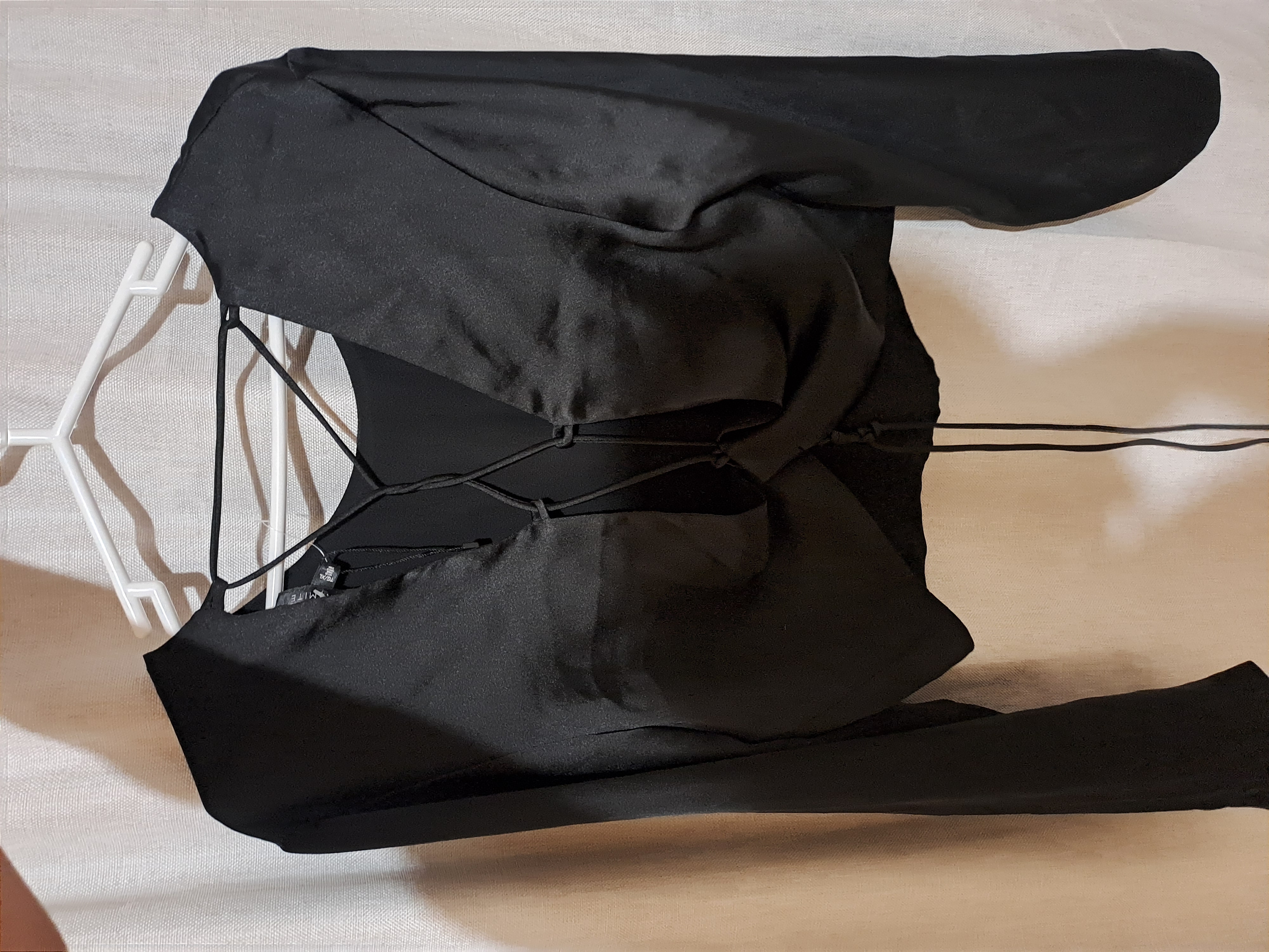 Blusa negra larga de seda, talla XL, con abertura en la espalda, muy cómoda.