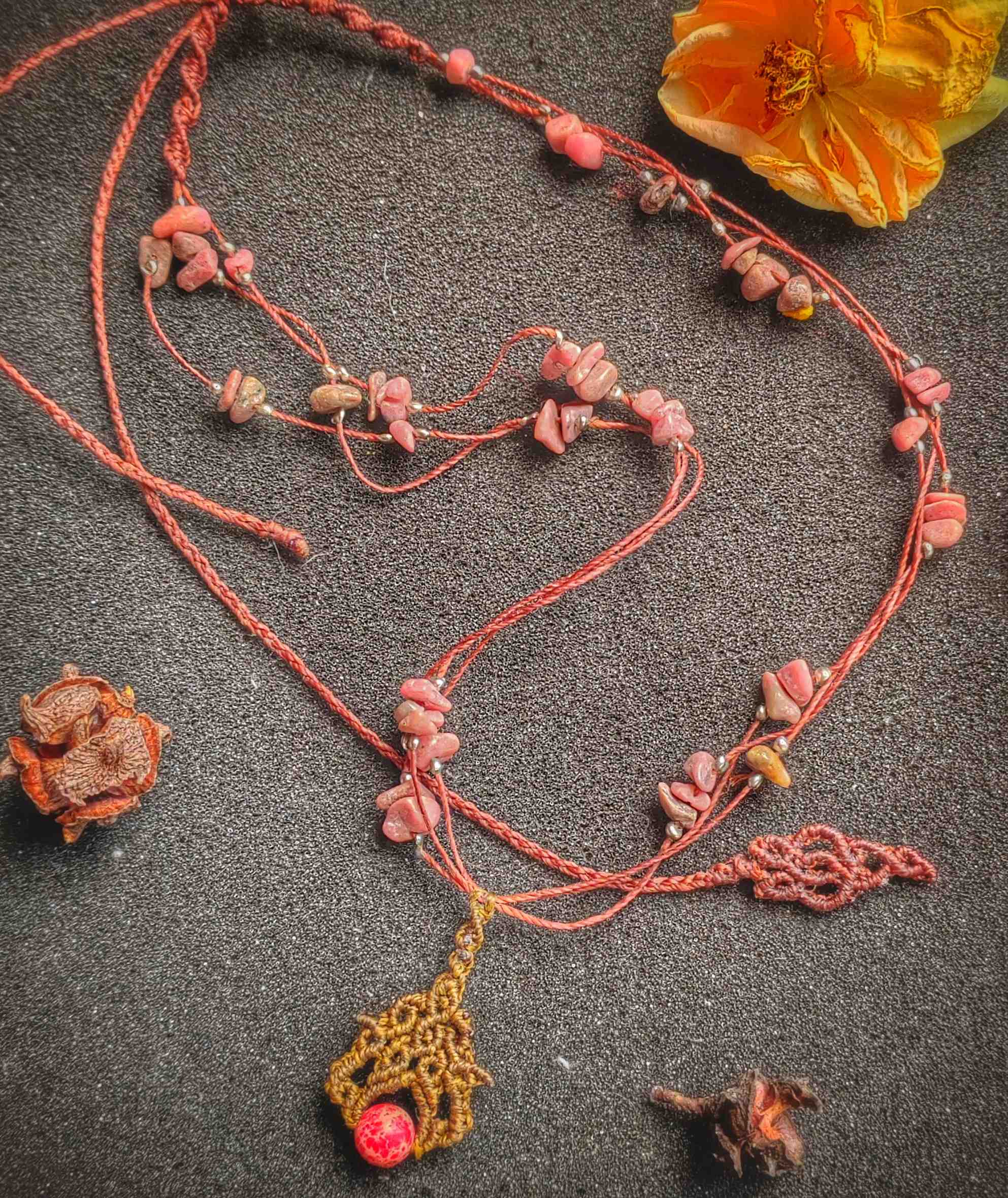 Este hermoso collar artesanal está elaborado con un cordón trenzado de color rojo y adornado con piedras naturales en tonos rosados, la hermosa rodocrosita. Piedra nacional de Argentina. Su diseño único incluye un colgante central tejido a mano que sostiene una aghata roja, aportando un toque distintivo y elegante. Ideal para complementar cualquier atuendo, este collar es perfecto para quienes aprecian la joyería hecha a mano y los materiales naturales.