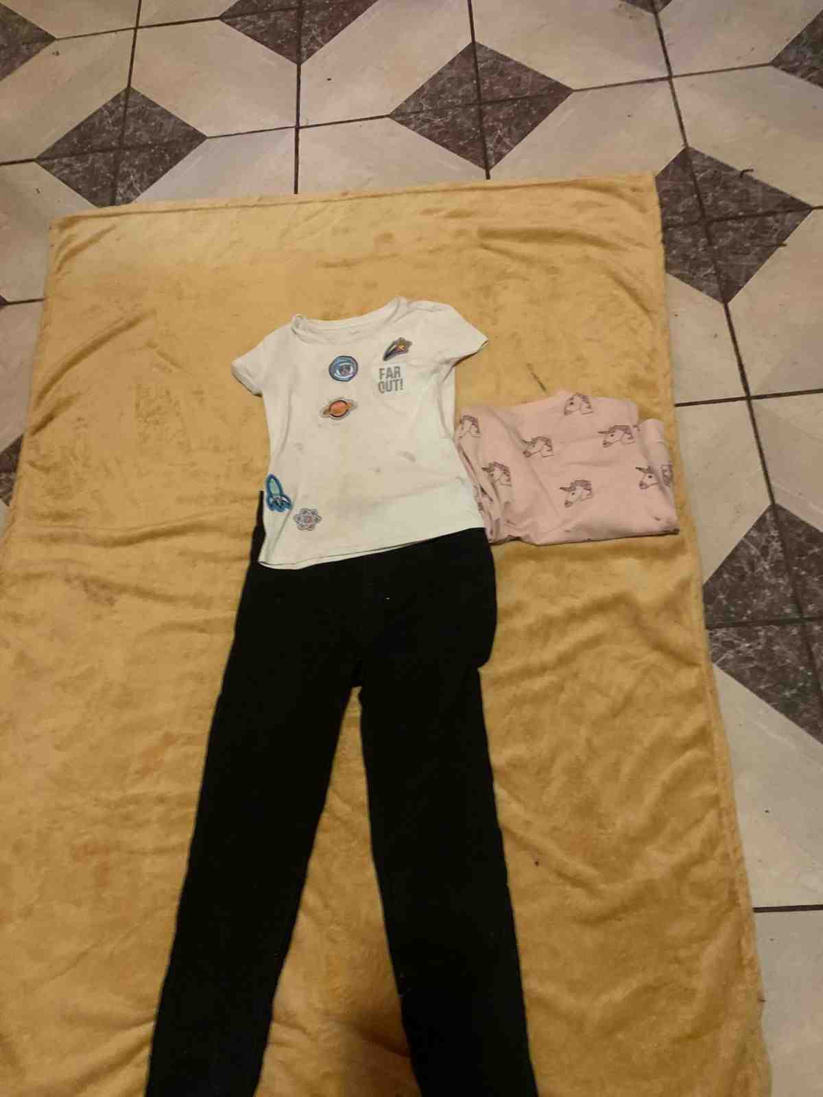 Conjunto camisa color blanca con estampado galáctico y un pantalón color negro de tela mezclilla, adicional gratis un suéter de unicornio Rosado. para niños de 7 a 9 años