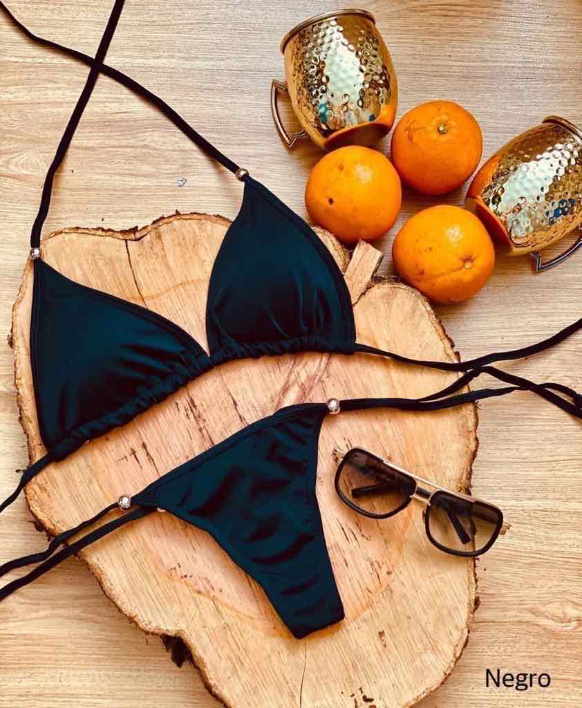 Este conjunto de bikini está disponible en una variedad de colores vibrantes como negro, verde jade, terracota, lila y mora. Diseñado con un estilo clásico de triángulo, ofrece un ajuste cómodo y favorecedor. Ideal para disfrutar de un día soleado en la playa o la piscina. Fabricado con materiales de alta calidad que aseguran durabilidad y resistencia al agua. Perfecto para quienes buscan estilo y comodidad en sus trajes de baño.