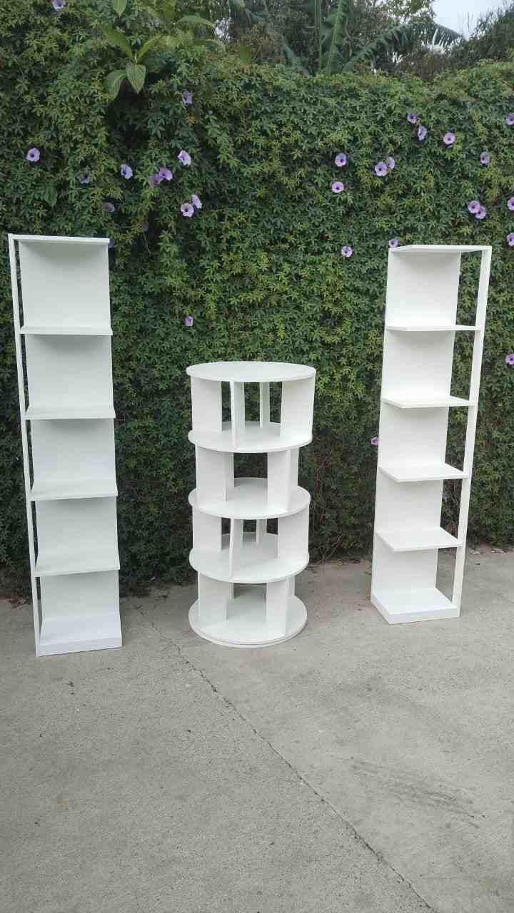 Conjunto de estanterías modernas en color blanco, ideales para cualquier espacio del hogar u oficina. Incluye dos estanterías verticales con múltiples niveles para almacenamiento eficiente. Además, cuenta con una estantería circular central que añade un toque de diseño único. Fabricadas con materiales de alta calidad, estas estanterías son perfectas para organizar libros, decoraciones y más.
