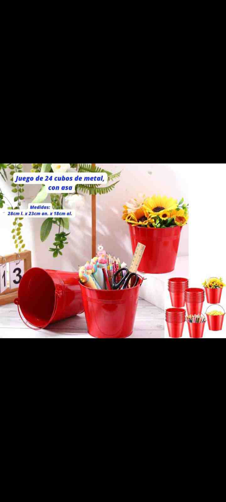 Este juego incluye 24 cubos de metal con asa, perfectos para organizar y decorar cualquier espacio. Su diseño en color rojo vibrante añade un toque de color y estilo. Son ideales para almacenar artículos de oficina, utensilios de cocina o incluso para usarlos como macetas decorativas. Con medidas de 28 cm de largo, 23 cm de ancho y 18 cm de alto, ofrecen un espacio amplio y versátil.