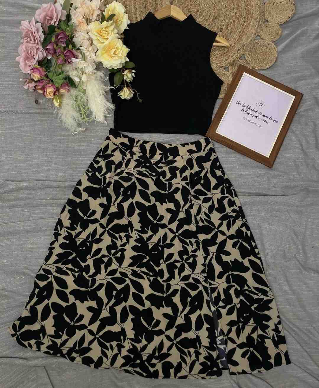 Este conjunto elegante consta de una blusa sin mangas de color negro y una falda con un diseño floral en tonos beige y negro. La blusa presenta un corte moderno y ajustado, ideal para combinar con la falda de corte amplio que ofrece comodidad y estilo. Perfecto para ocasiones formales o casuales, este conjunto es una opción versátil para cualquier guardarropa. La calidad de los materiales asegura durabilidad y un ajuste favorecedor.