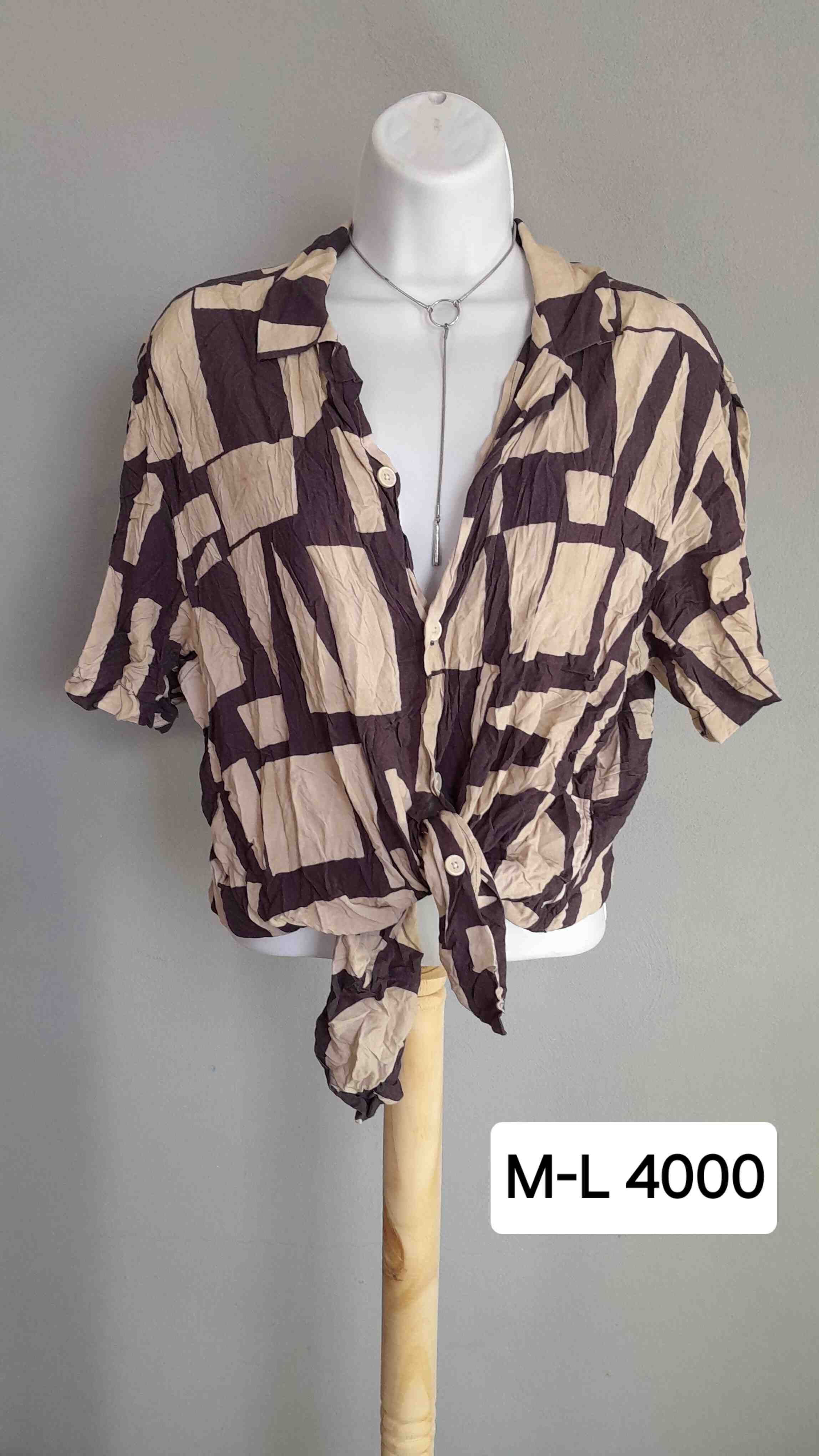 Esta camisa de diseño moderno presenta un estampado geométrico en tonos oscuros y claros, ideal para un look casual y a la moda. Confeccionada en un tejido ligero, es perfecta para climas cálidos. Su diseño de manga corta y cierre frontal con botones la hace cómoda y fácil de llevar. Disponible en talla M-L, es una prenda versátil que se adapta a diferentes estilos.