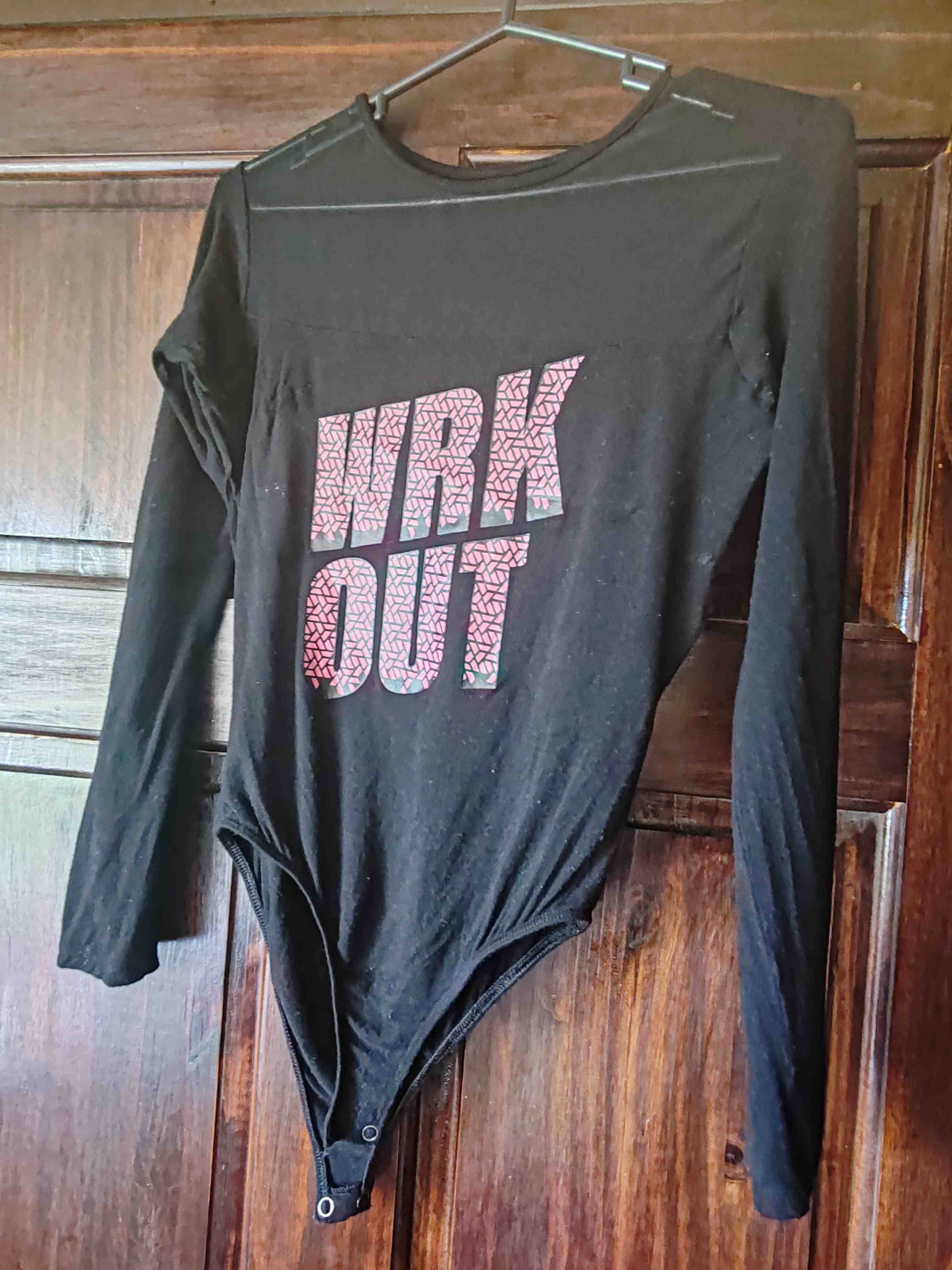 Este elegante body negro es perfecto para tus sesiones de ejercicio o para un look casual. Con un diseño de manga larga y un estampado llamativo de 'WRK OUT' en el frente, es ideal para quienes buscan comodidad y estilo. Fabricado con materiales de alta calidad, ofrece un ajuste ceñido que realza la figura. Su cierre de botones a presión en la parte inferior asegura un ajuste seguro y fácil de usar.