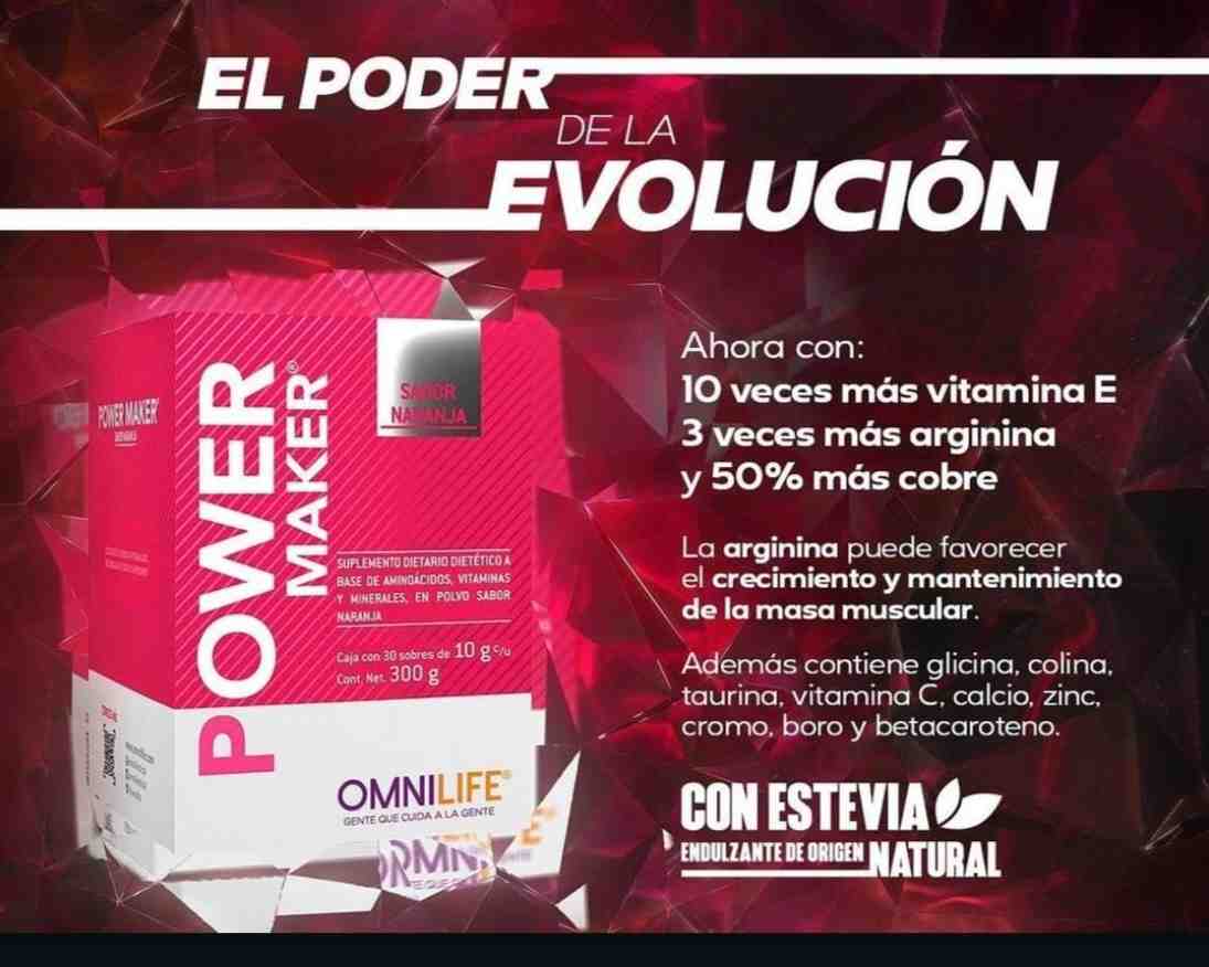 Power Maker de Omnilife es un suplemento dietético en polvo con sabor a naranja, diseñado para apoyar el crecimiento y mantenimiento de la masa muscular. Contiene 10 veces más vitamina E, 3 veces más arginina y 50% más cobre. Además, incluye glicina, colina, taurina, vitamina C, calcio, zinc, cromo, boro y betacaroteno. Endulzado con estevia, es una opción natural para quienes buscan mejorar su rendimiento físico.