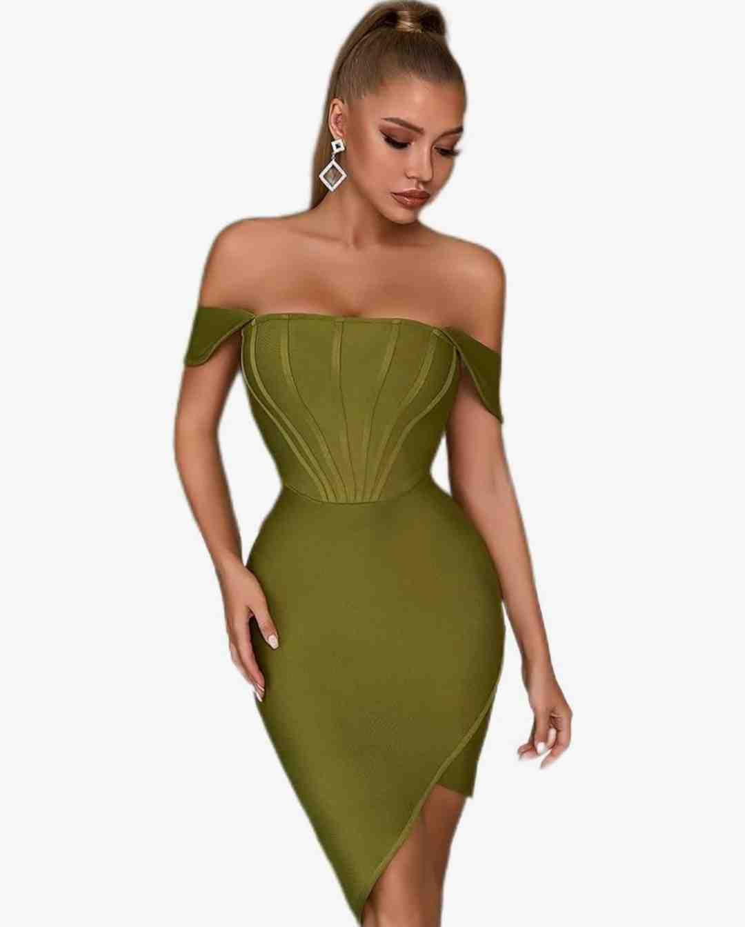 Este elegante vestido ajustado en color verde oliva es perfecto para ocasiones especiales. Su diseño sin tirantes resalta los hombros, mientras que el corte asimétrico en la falda añade un toque moderno. Confeccionado en un tejido elástico que se adapta al cuerpo, ofrece comodidad y estilo. Ideal para eventos nocturnos o cenas formales, este vestido es una opción versátil y sofisticada.