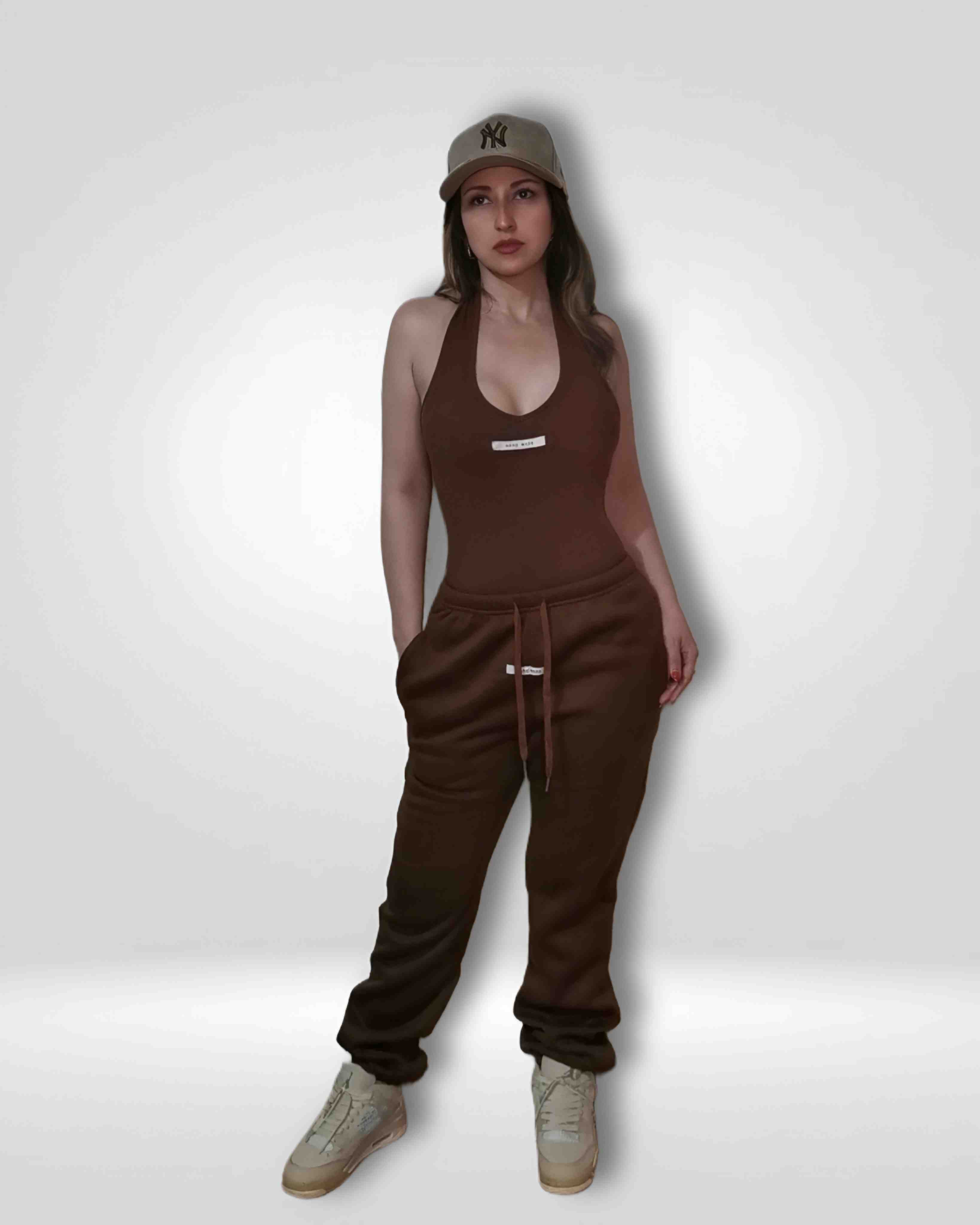 Talla S. Este conjunto deportivo marrón es ideal para quienes buscan comodidad y estilo en su día a día. El body sin mangas ofrece un diseño ajustado que resalta la figura, mientras que el pantalón cuenta con una cintura elástica y cordones ajustables para un ajuste perfecto. Perfecto para actividades casuales o deportivas. El color marrón le da un toque moderno y versátil, fácil de combinar con otros accesorios. Completa el look con unas zapatillas deportivas para un estilo urbano.