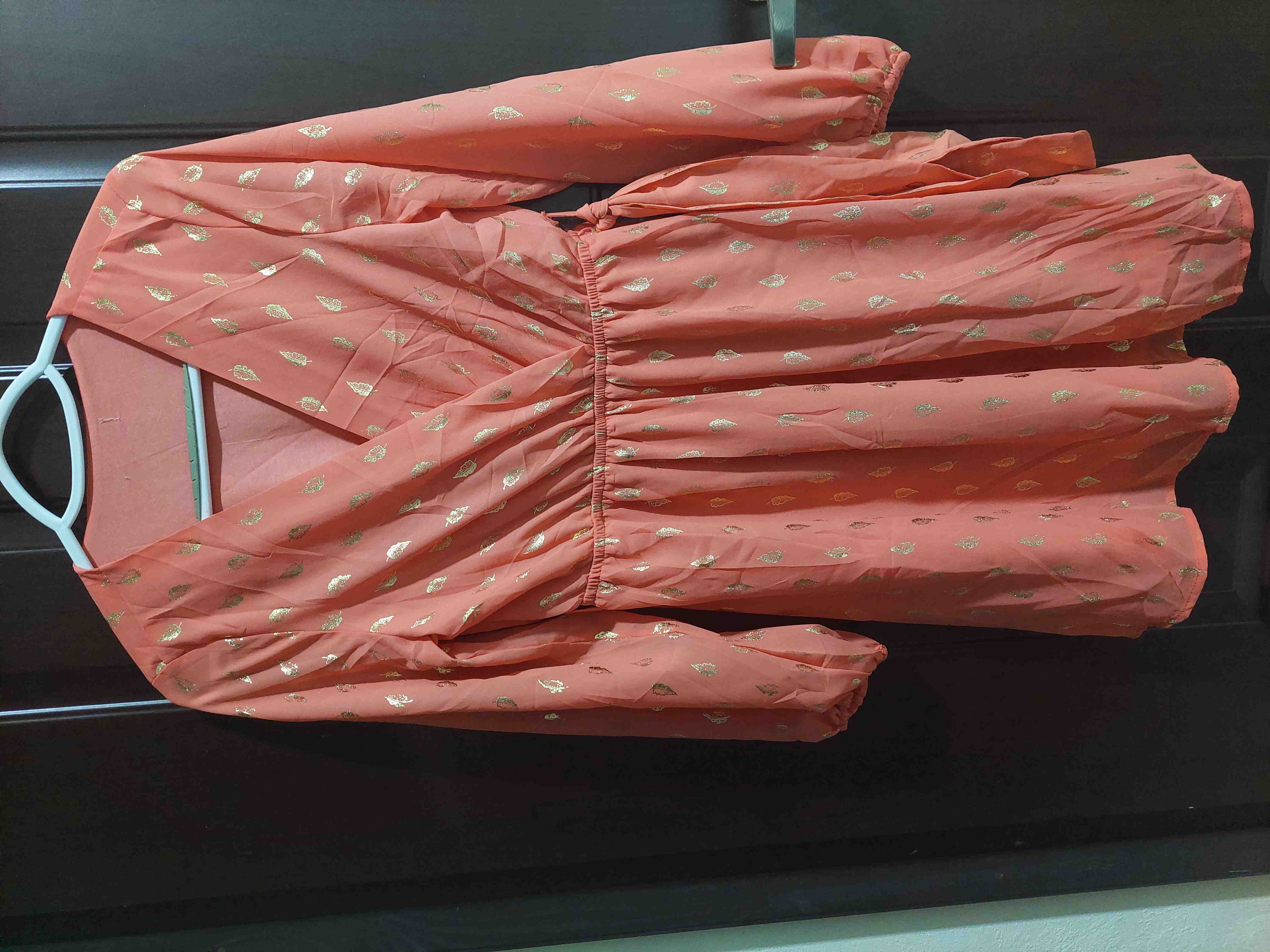 Este vestido de color coral es perfecto para ocasiones especiales. Presenta un elegante estampado dorado que añade un toque de sofisticación. La tela es ligera y cómoda, ideal para climas cálidos. Su diseño incluye mangas largas y un corte que favorece la figura. Es una prenda versátil que se puede combinar con diferentes accesorios para lograr un look único.