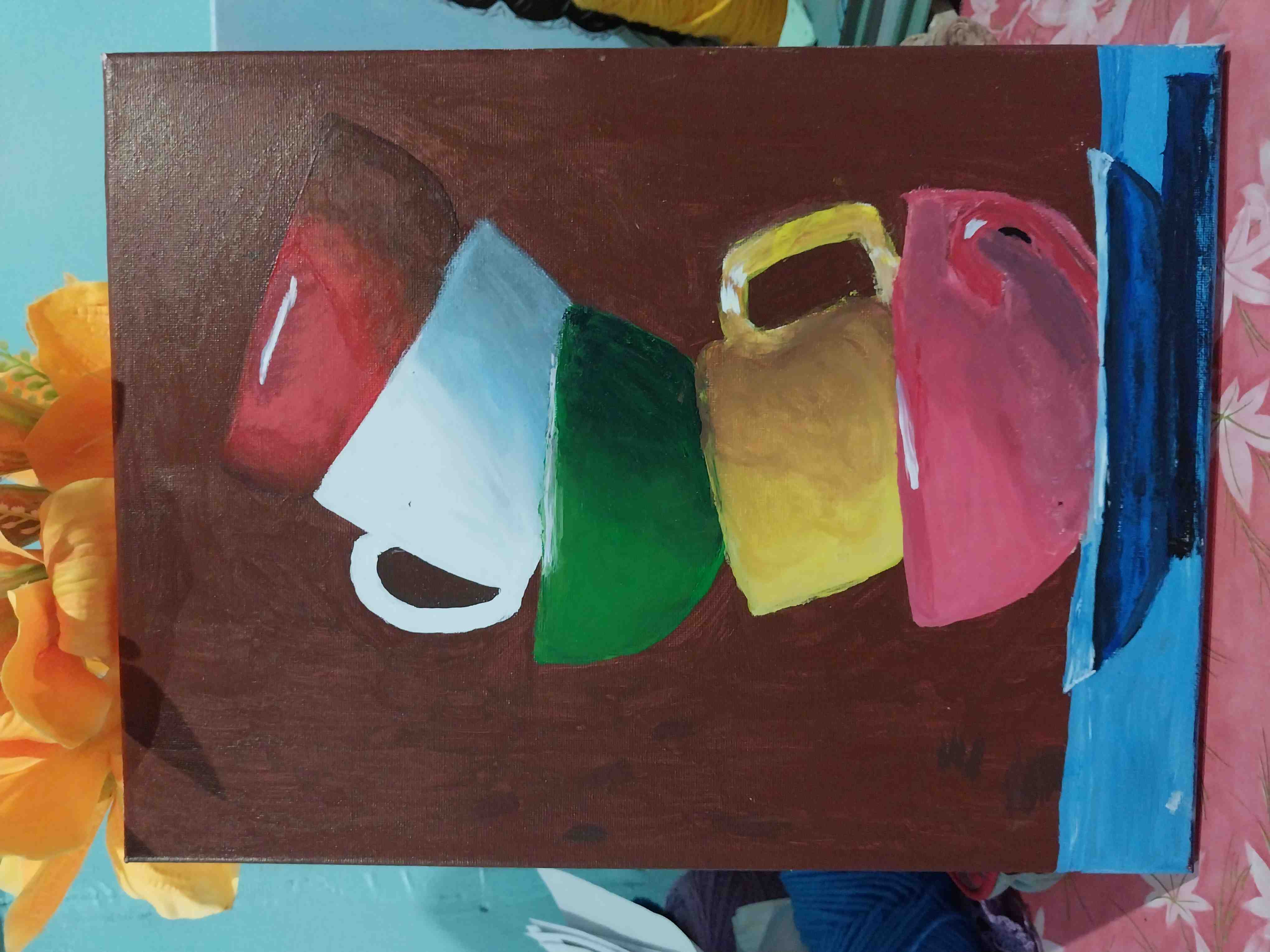 Esta pintura presenta una composición de tazas de diversos colores, incluyendo rojo, blanco, verde, amarillo y rosa. Las tazas están dispuestas sobre un fondo marrón, creando un contraste vibrante y atractivo. La obra utiliza una técnica de pinceladas amplias y colores sólidos, lo que le da un aspecto moderno y llamativo. Ideal para decorar espacios como la cocina o el comedor, aportando un toque de color y originalidad. La pintura está montada sobre un lienzo de tamaño mediano.