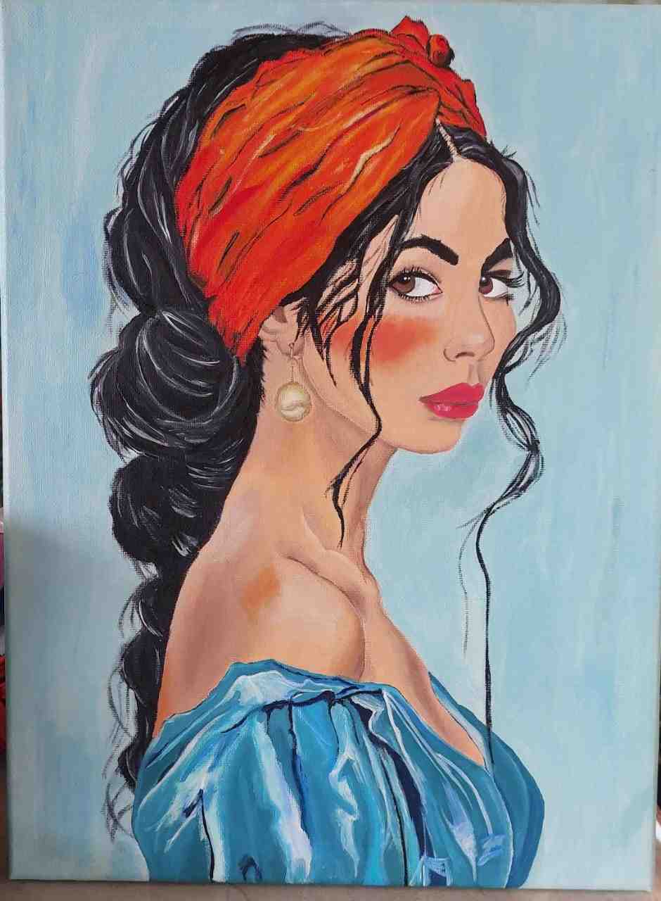 Esta pintura artística presenta a una mujer con un elegante turbante rojo que contrasta con su cabello oscuro. La obra destaca por su uso vibrante de colores, especialmente el azul del vestido que aporta un toque de serenidad. El fondo claro resalta la figura central, creando un efecto visual atractivo. Ideal para decorar espacios que buscan un toque de sofisticación y arte. La técnica utilizada en la pintura resalta los detalles y texturas, haciendo de esta pieza una adición única a cualquier colección.