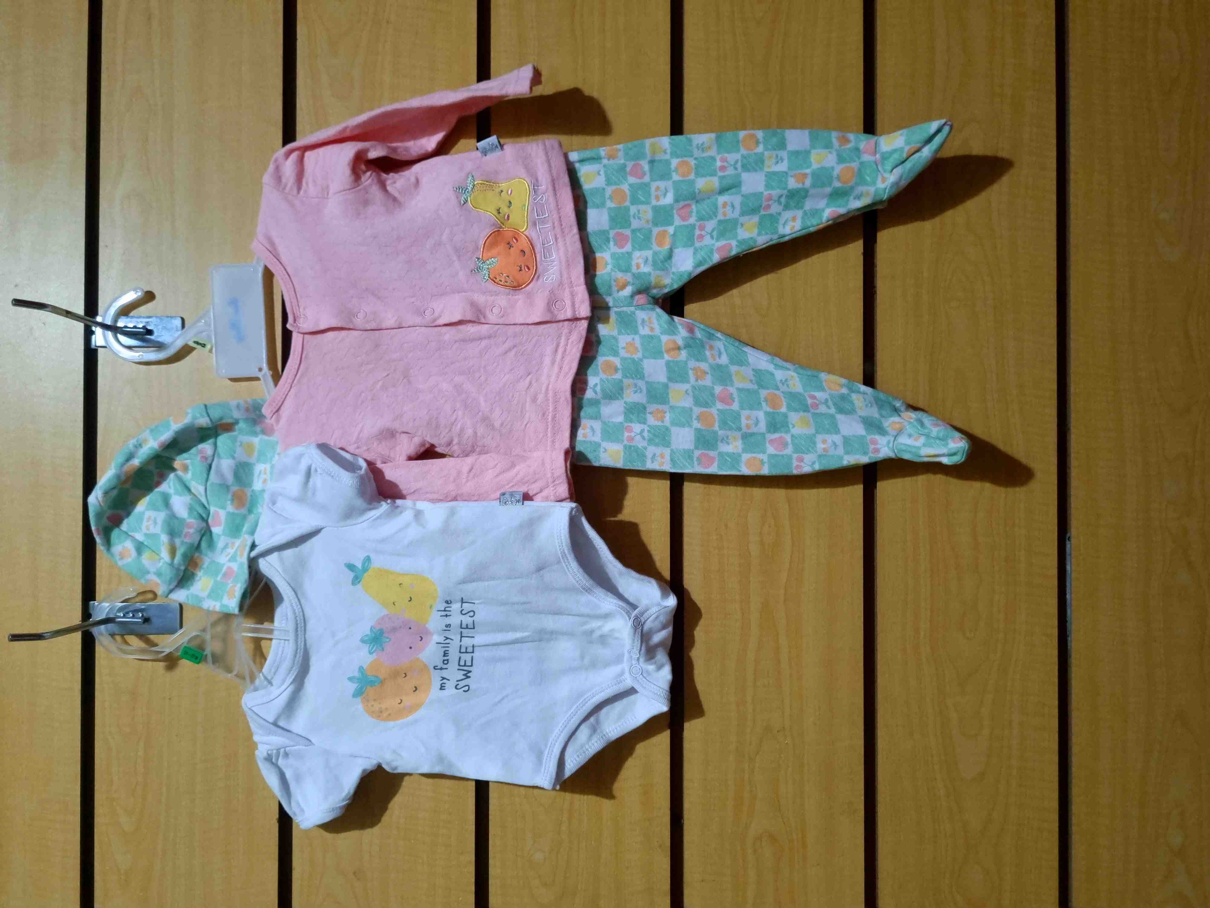 Este adorable conjunto de ropa para bebé incluye un body blanco con estampado de frutas y la frase 'my family's little sweetest'. El conjunto también cuenta con un pantalón con pies cubiertos y un diseño de cuadros en tonos pastel, complementado con un abrigo de broches color papaya pastel con detalles de frutas. Además, incluye un gorro a juego para mantener al bebé abrigado. Fabricado con materiales suaves y cómodos, ideal para la delicada piel del bebé.