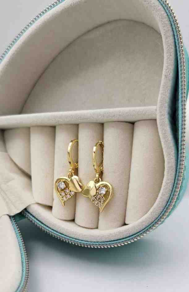 Estos elegantes aretes presentan un diseño en forma de corazón, elaborados en un tono dorado brillante que resalta su sofisticación. Cada arete está adornado con pequeñas piedras brillantes que añaden un toque de glamour y elegancia. Son perfectos para ocasiones especiales o para darle un toque chic a tu atuendo diario. Su cierre de gancho asegura un ajuste cómodo y seguro. Vienen presentados en un estuche acolchado que los protege y facilita su almacenamiento.