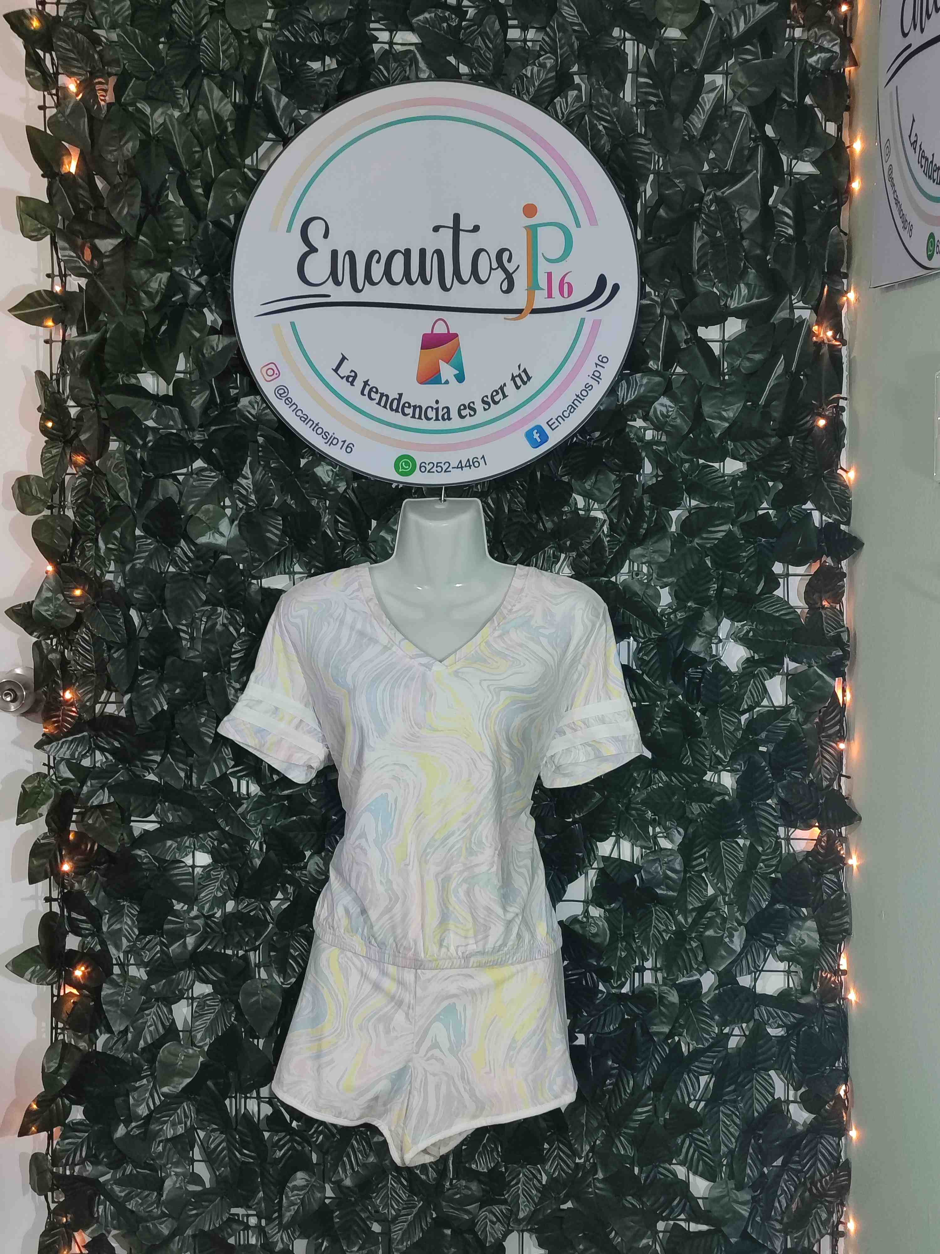 Este conjunto de deportivo es perfecto para hacer ejercicio con estilo. Confeccionado en un tejido suave y ligero, ofrece comodidad durante todo el día. El diseño presenta un estampado de colores pastel que le da un toque moderno y fresco. La camiseta de manga corta tiene un escote en V, mientras que el pantalón corto cuenta con una cintura elástica para un ajuste cómodo. Este conjunto es una excelente opción para relajarse en casa.