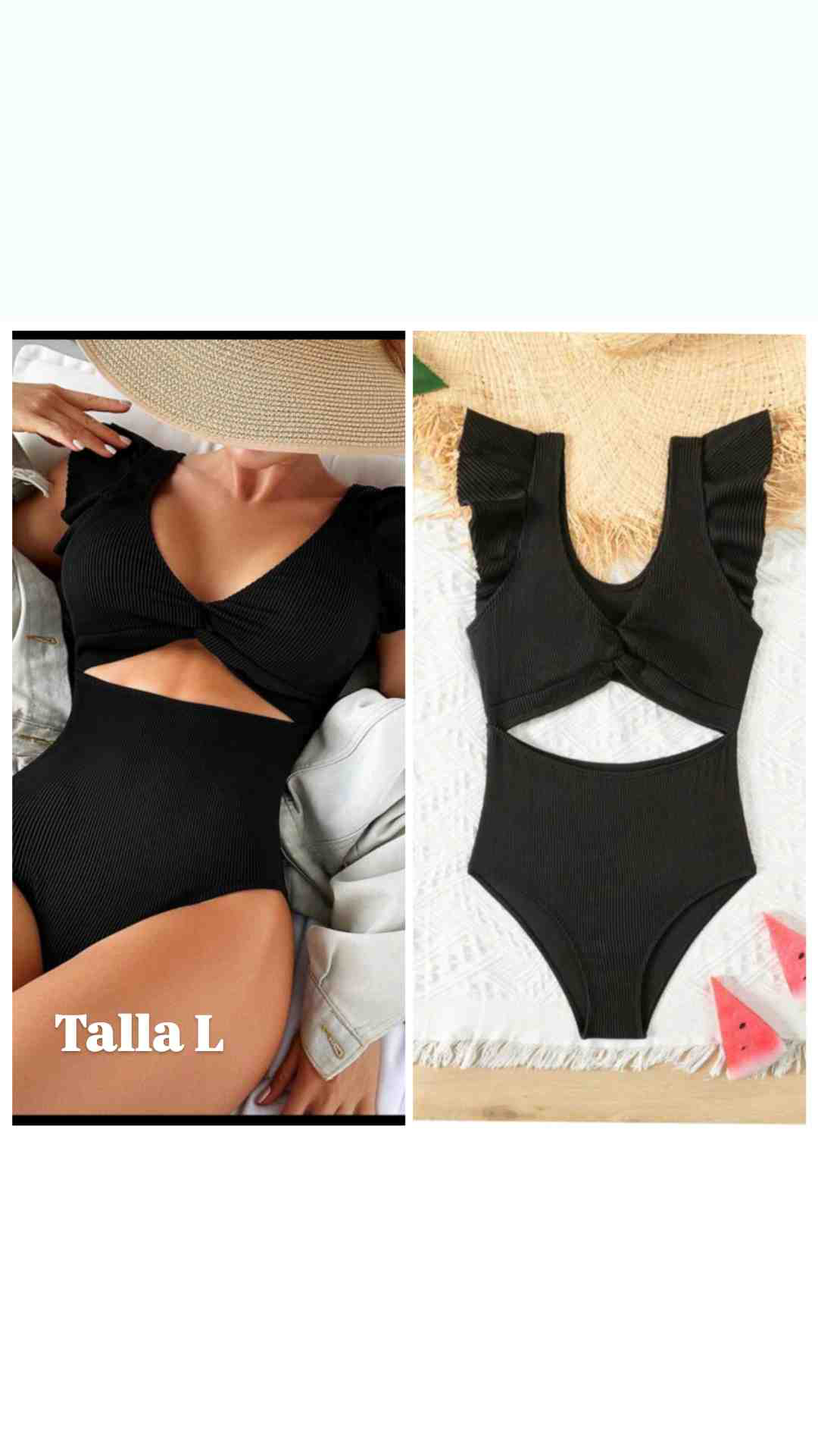 Este elegante traje de baño de una pieza en color negro es ideal para disfrutar de un día de playa o piscina. Su diseño incluye un corte en la parte frontal que añade un toque moderno y atractivo. Fabricado con materiales de alta calidad, ofrece comodidad y durabilidad. Las mangas con volantes le dan un estilo único y femenino. Disponible en talla L, se adapta perfectamente a la figura, proporcionando un ajuste seguro y cómodo.