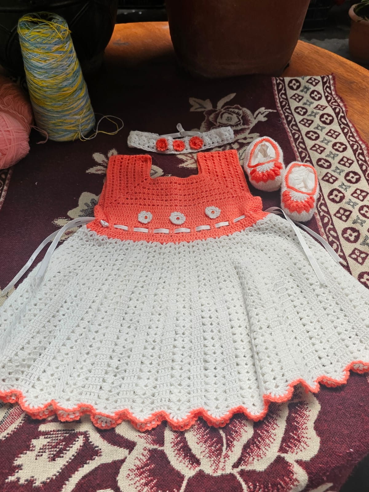 Este encantador vestido de bebé está tejido a crochet, combinando colores blanco y coral para un diseño delicado y atractivo. Incluye un vestido con detalles de flores y un borde ondulado que añade un toque especial. El conjunto se completa con una diadema a juego y unos zapatitos tejidos, perfectos para cualquier ocasión especial. Hecho con materiales suaves y cómodos, es ideal para la piel sensible de los bebés. Este conjunto es una opción perfecta para regalar o para vestir a tu bebé con estilo.