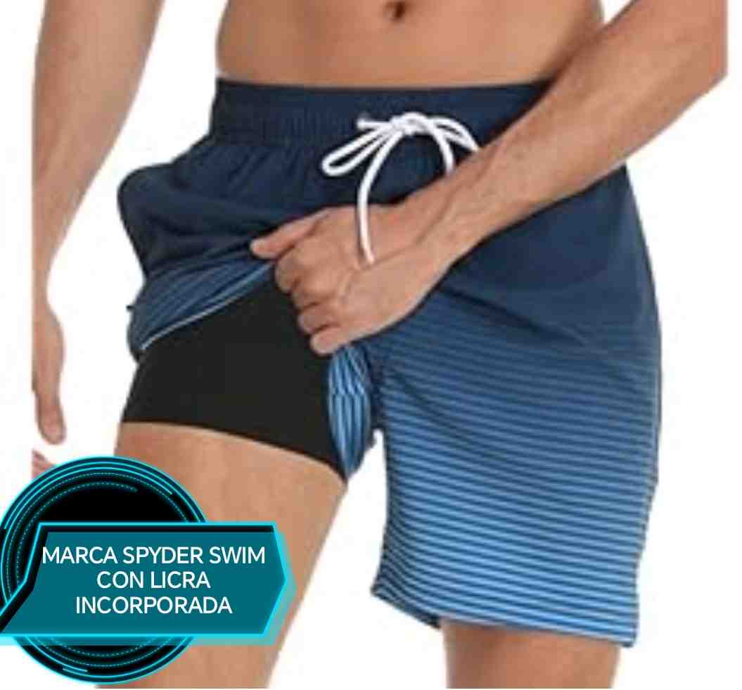 Este short de baño de la marca Spyder Swim es ideal para actividades acuáticas. Cuenta con una licra incorporada que proporciona mayor comodidad y ajuste. El diseño en tonos azules con rayas es moderno y atractivo. La cintura elástica con cordón asegura un ajuste perfecto. Fabricado con materiales de alta calidad, es resistente al agua y de secado rápido. Perfecto para nadar o disfrutar de un día en la playa.