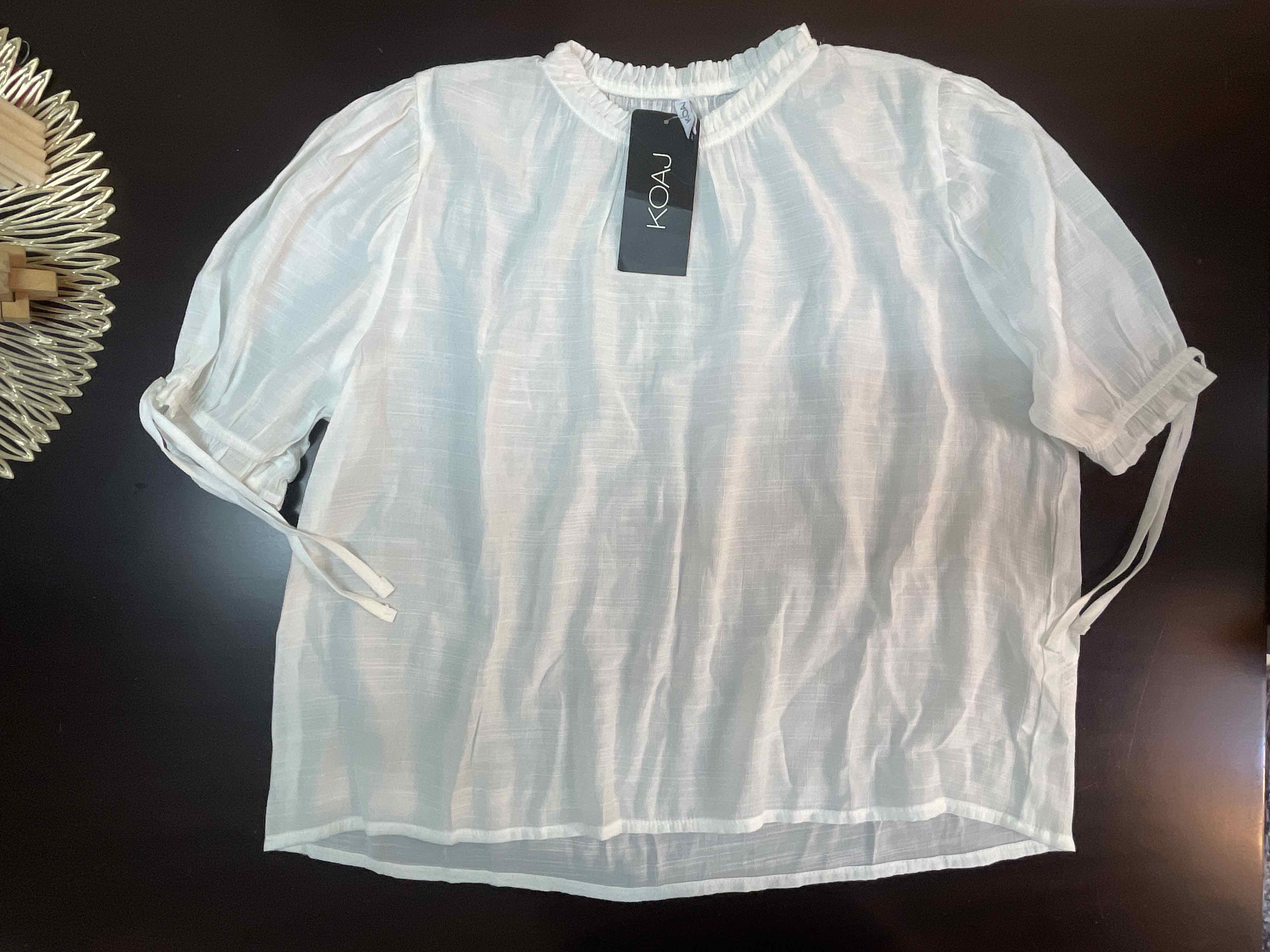 Esta blusa blanca de la marca KOAJ es una prenda versátil y cómoda para cualquier ocasión. Confeccionada en un tejido ligero, ofrece frescura y comodidad durante todo el día. Su diseño incluye mangas con lazos ajustables, lo que permite personalizar el ajuste según el estilo deseado. El cuello redondo con detalles fruncidos añade un toque de elegancia discreta. Ideal para combinar con jeans o faldas, esta blusa es una excelente adición a cualquier guardarropa.