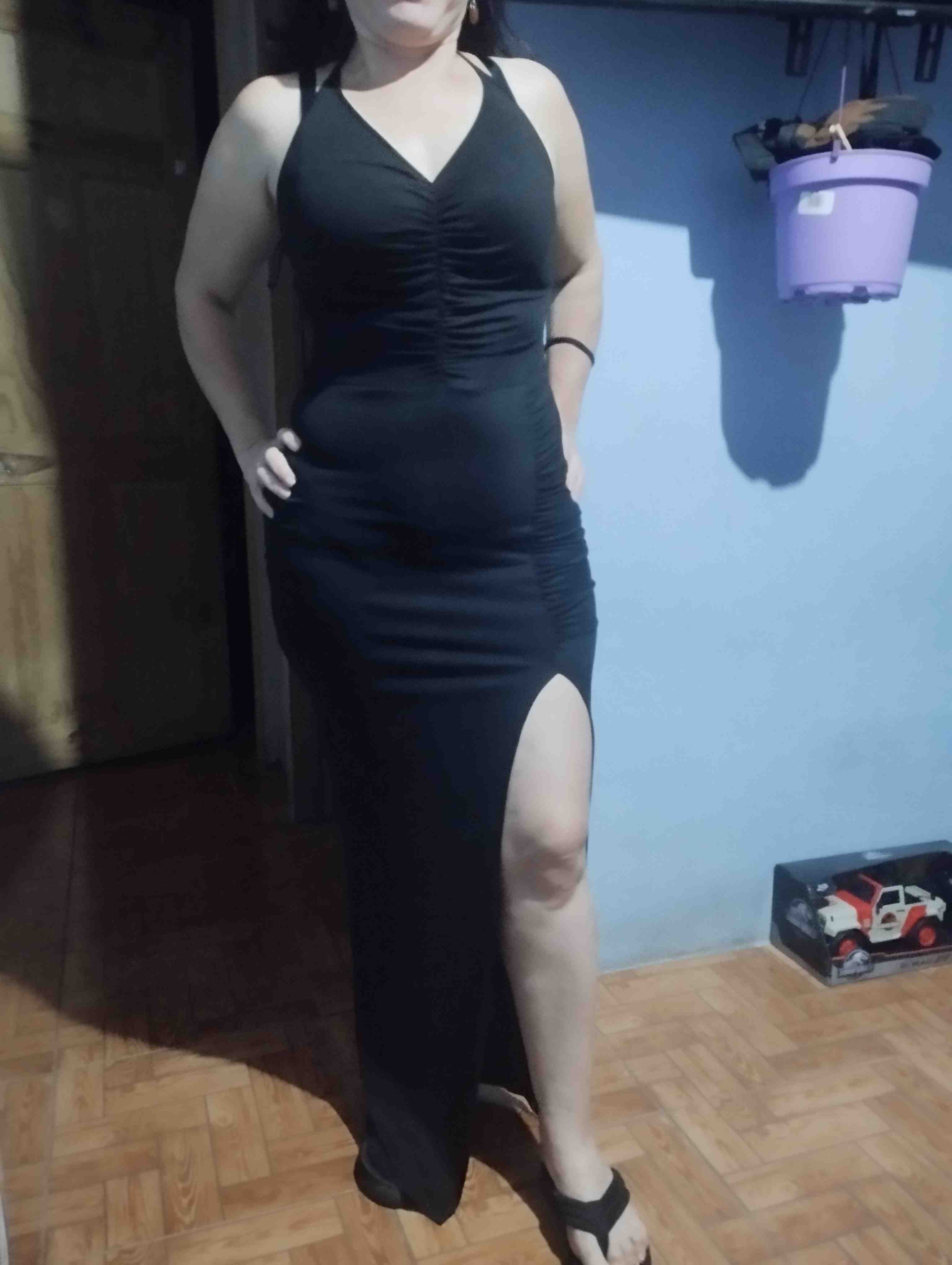 Este elegante vestido largo negro es perfecto para ocasiones especiales. Con un diseño ajustado que resalta la figura, cuenta con una abertura lateral que añade un toque de sofisticación. El material es suave y cómodo, ideal para llevar durante toda la noche. Su color negro clásico lo hace fácil de combinar con cualquier accesorio. El escote en V y los tirantes anchos ofrecen un ajuste seguro y favorecedor.